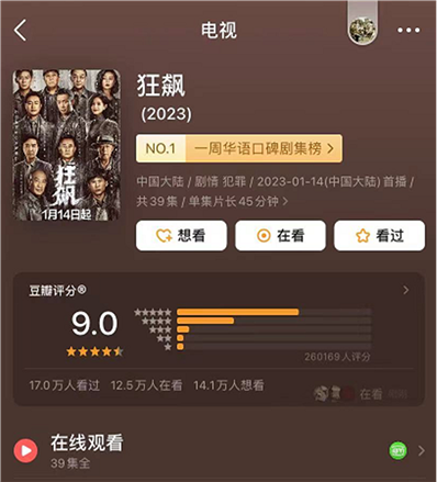 自播出以来,《狂飙》好评如潮,不少人的对话都是“你看《狂飙》了吗?”其热度也像剧名一般“狂飙”,目前豆瓣评分达到9.0。