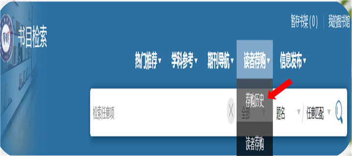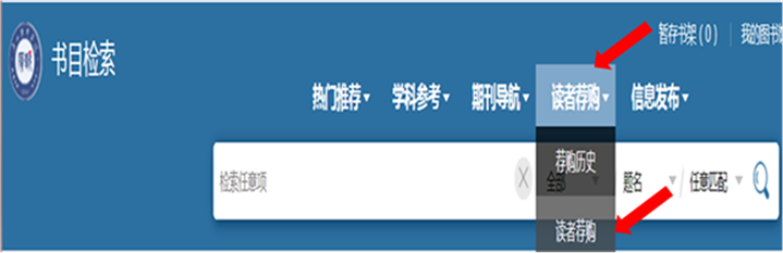 步骤4:读者如需了解自己荐购图书的数量和后续进展情况,可以点击“读者荐购”下拉菜单里面的“荐购历史”选项