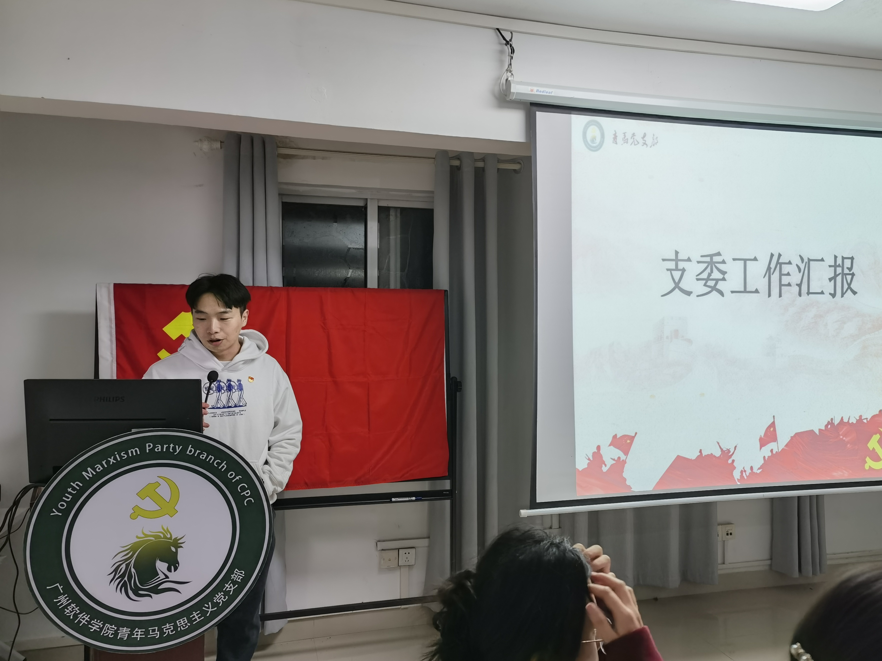 青马党支部委员邓智仁同志对本月青马党支部的工作进行汇报和总结,其中指出本月将会进行支部委员会换届大会,以及期末校拖拖回收的工作,并简述了下学期校伞伞的实施计划。