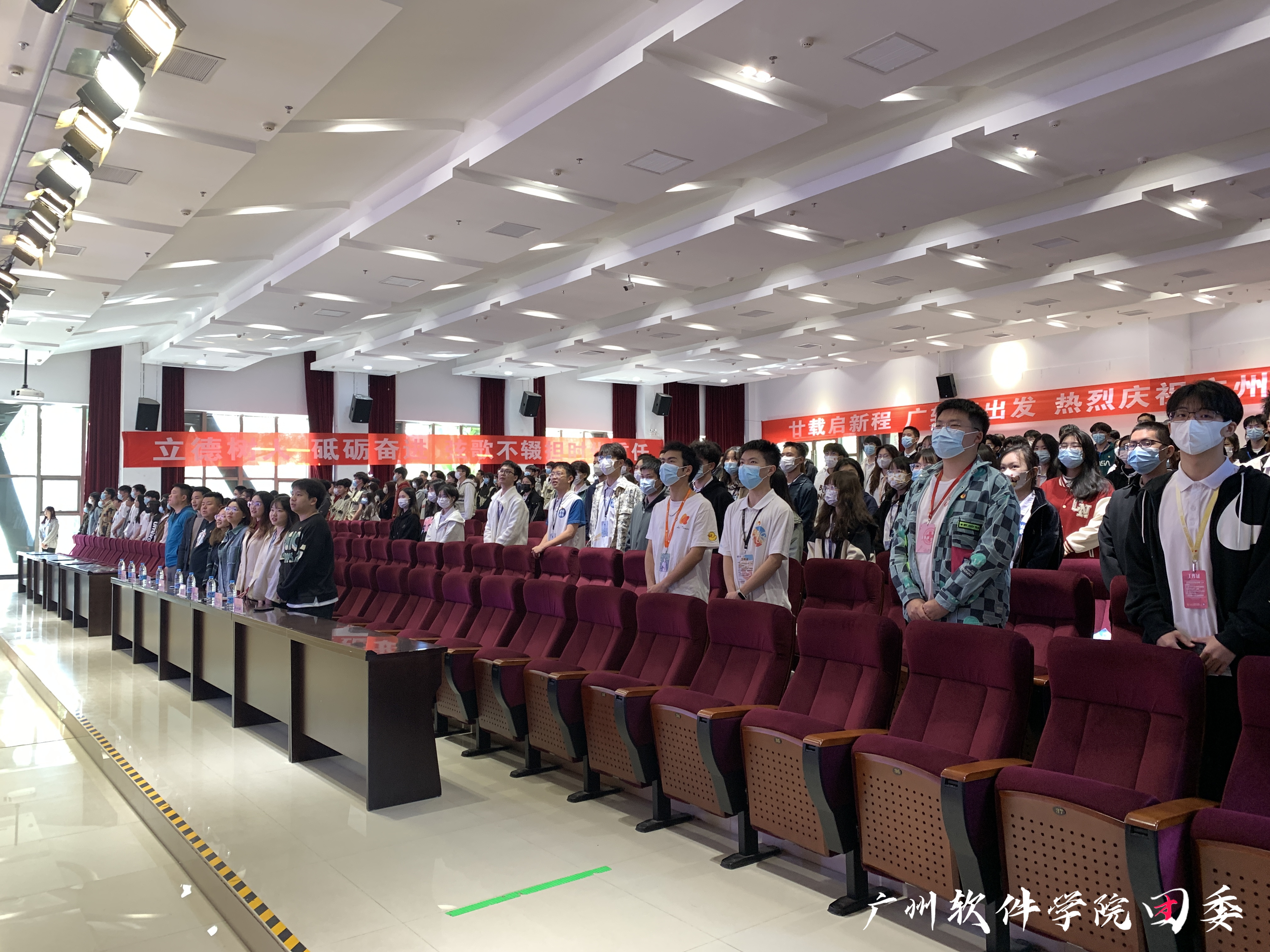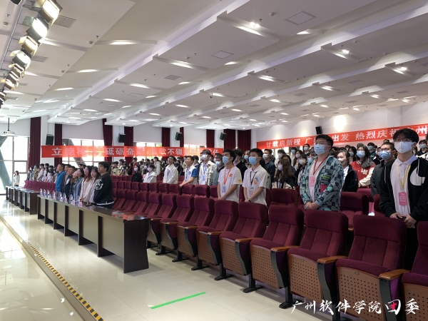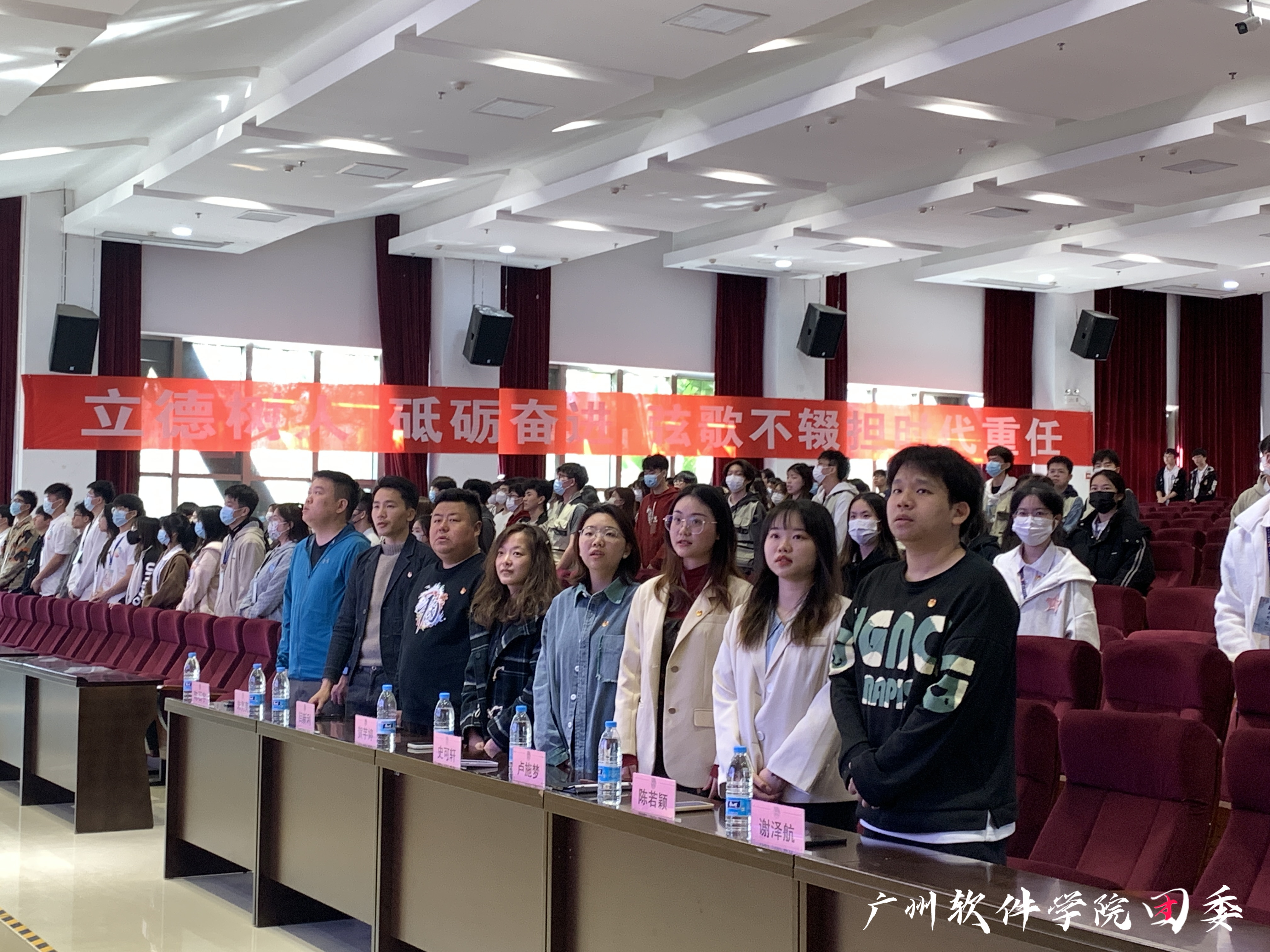 会议伊始,由主持人介绍大会流程,并带领全体人员起立奏唱国歌。在庄重的国歌下,歌声铿锵有力,一展朝气。随后主持人刘竹君同学介绍大会到场的领导以及嘉宾。