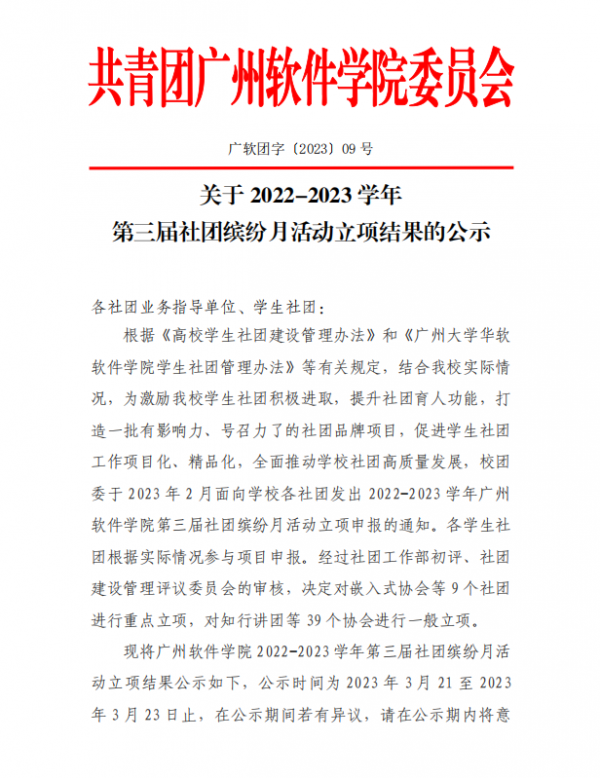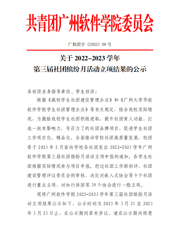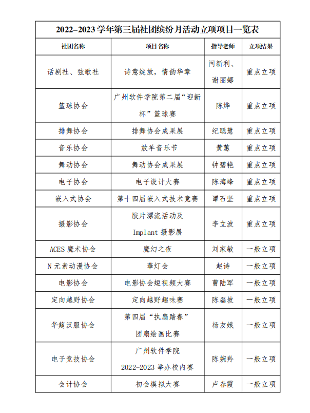 关于 2022-2023 学年第三届社团缤纷月活动立项结果的公示