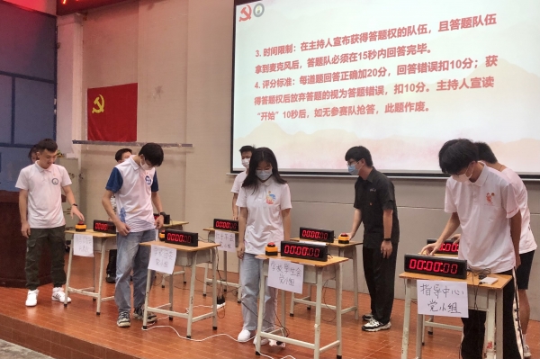在观众互动环节中,各党小组的积极分子们踊跃举手回答,展现了良好的精神风貌。经过三轮激烈的比拼后,由于青马党支部代表队和学校团委党小组出现同分现象,比赛进行紧张的加时赛环节,由两队派出的选手代表使用计时器获取答题机会。