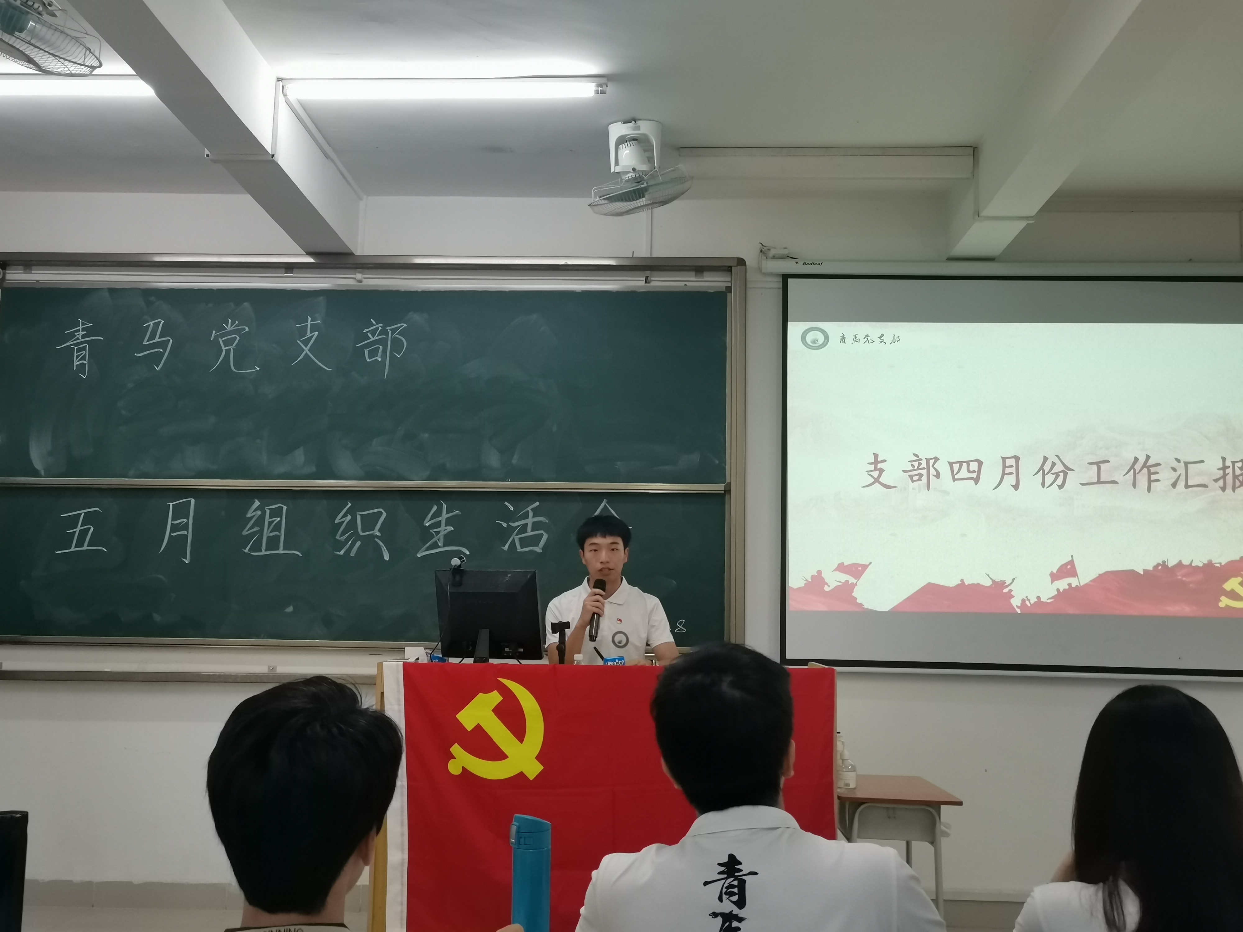 首先,支部支委邓智仁同志对青马党支部四月的工作进行了汇报。一是党员同志,站在疫情防控最前沿。青马党支部4月份在校同志积极参与学校核酸检测志愿活动,累计工作时长达200小时。二是介绍了支部三支队伍齐出力,“指南针”宣讲团参与录制学校团委百集团史故事;“新思想”读书班对入党积极分子党校培训班的学员进行了《中国共产党领导下的共青团运动》相关理论的领学;“好帮手”服务队在4月份策划组织了宿舍区乱石清理,教学楼的实验室卫生消杀工作及“校拖拖”项目的维护。三是筹办开展入党积极分子党校培训班及支部表彰事宜。