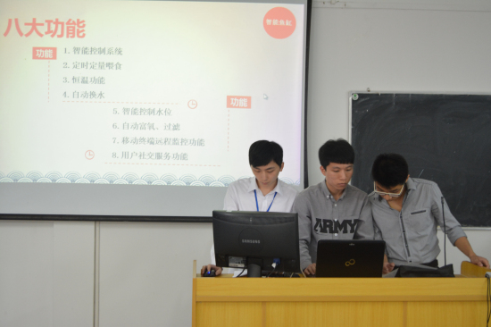 在现场的答辩环节,每个参赛团队都充分展示了自己产品的市场价值和研发的技术成果,对评审老师提出的问题一一作答,条理清晰,现场气氛十分紧张。来自电子系的作品“智能鱼缸”很好地颠覆了传统鱼缸的概念,能够做到根据鱼的类别自动放入相应的饲料,也能自动换水,非常适合家居、酒店等场所用于装饰,十分方便。另一个优秀作品“露天餐厅智能遮光雨棚”也是在传统智能雨棚的基础上添加了儿童锁、温度感应等功能,创意十足。