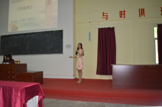 大赛分三个环节进行,12组选手在第一环节中大展风采,作品多以爱国主义为题材。此次大赛荣获一等奖的是第十组选手舒婷,她朗诵的《致橡树》赢得了评委老师的一致好评,二等奖是第十二组选手,作品来自朱自清的《匆匆》,她饱含深情的诵读感染了在场的所有观众。三等奖第四组选手以空灵幽美的调子为背景音乐,唱出了不一样的《诗经》,不一样的经典。