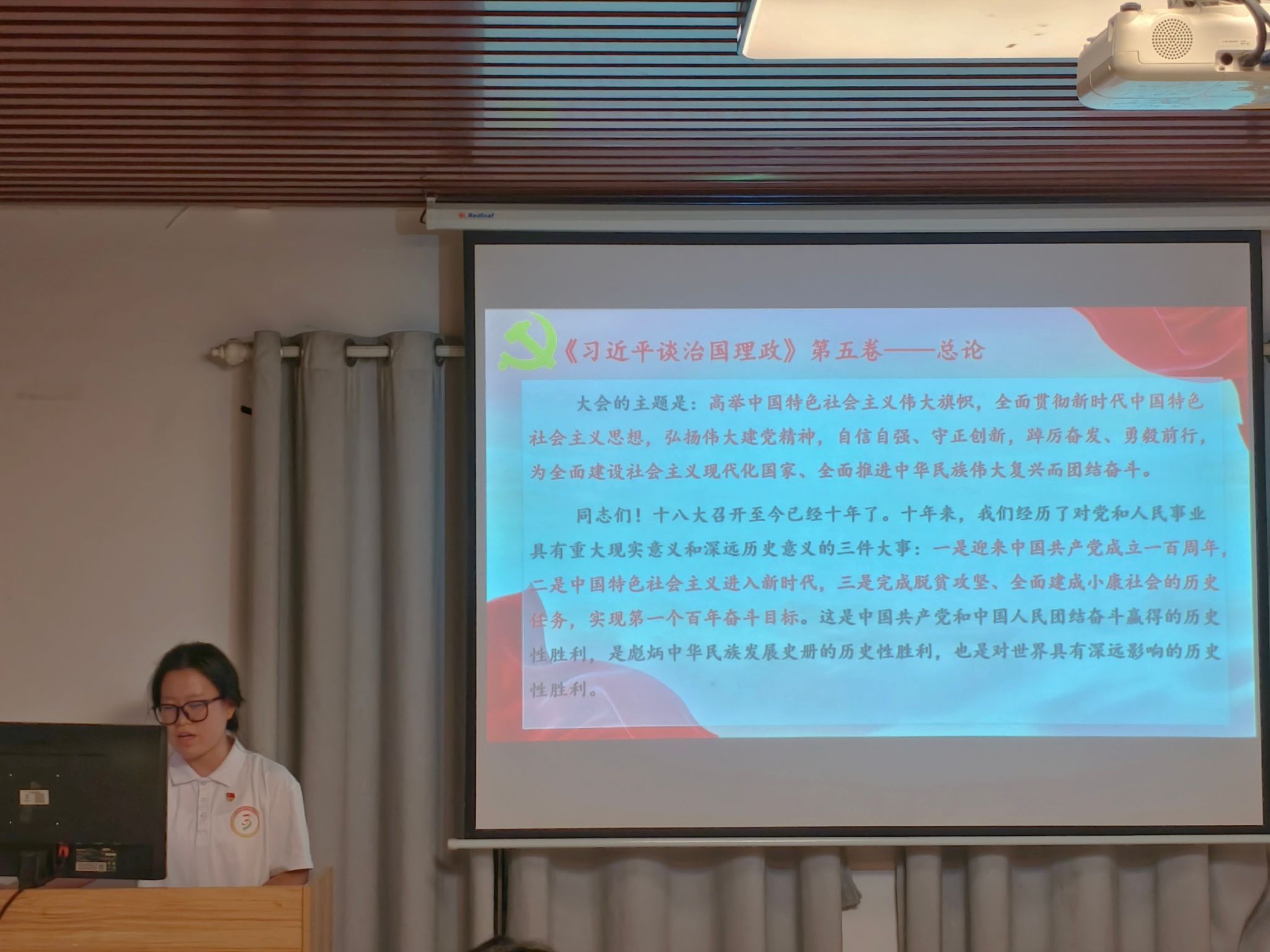 会议开始,由何培楠同志进行专题领学,开展本次组织生活会第一议题的学习——《习近平谈治国理政》第五卷。她首先向大家介绍了这本书的出版背景并解读了全书的整体框架,接着又向大家分享了这本书的学习指南。此次专题学习主要围绕“总论”展开,她向大家解读了“以中国式现代化全面推进中华民族伟大复兴”“加快构建新发展格局”“进一步全面深化改革”“党的自我革命、自我净化”等方面的内容,带领党员同志们深刻领悟了“两个确立”的决定性意义,指引党员同志们增强“四个意识”、坚定“四个自信”、做到“两个维护”,从而准确把握历史方位、使命任务,汲取实干担当的奋进力量,为实现中华民族伟大复兴的中国梦不断助力。