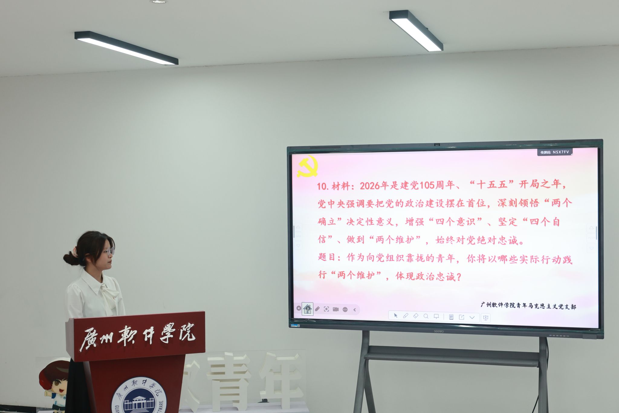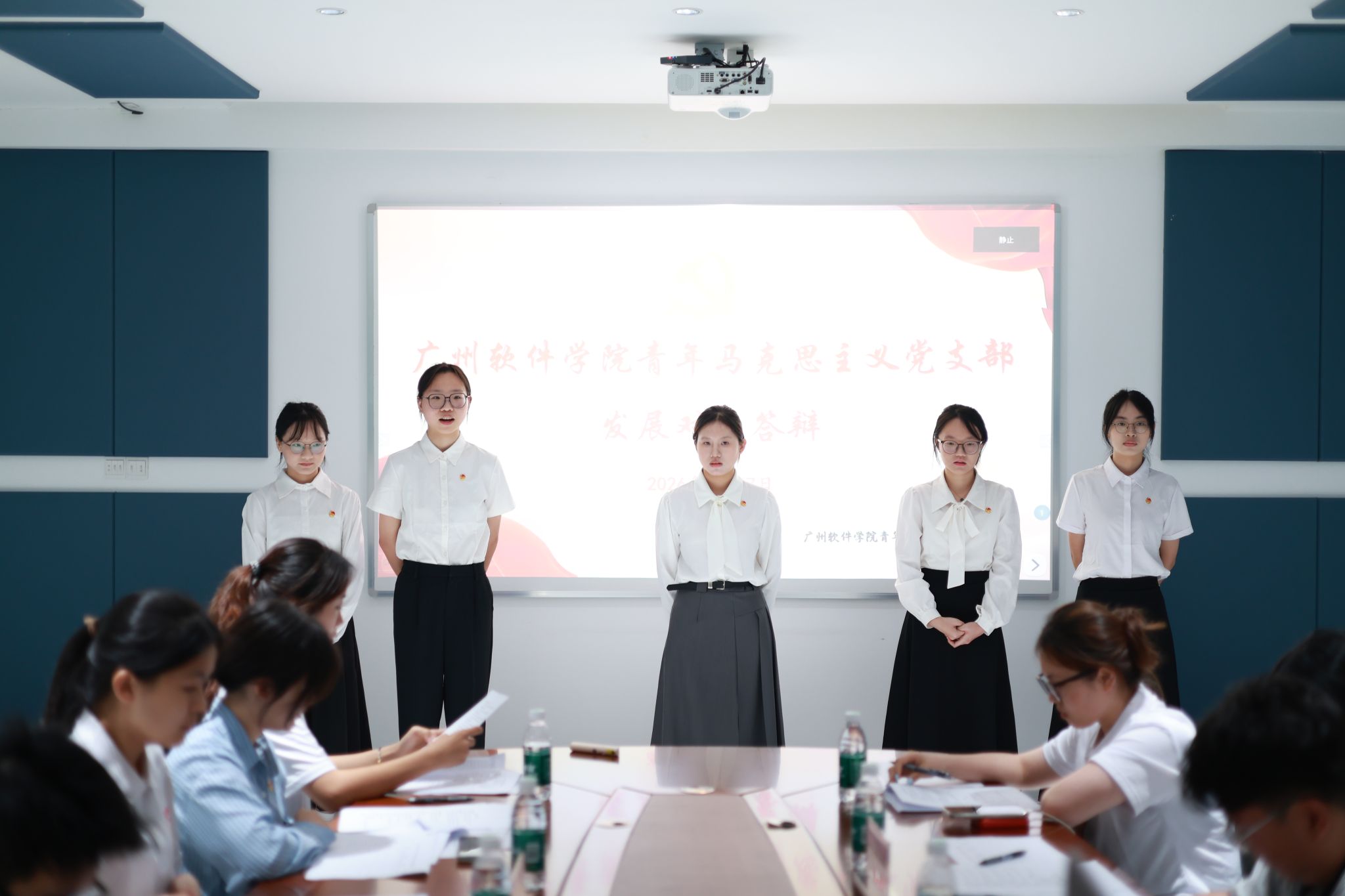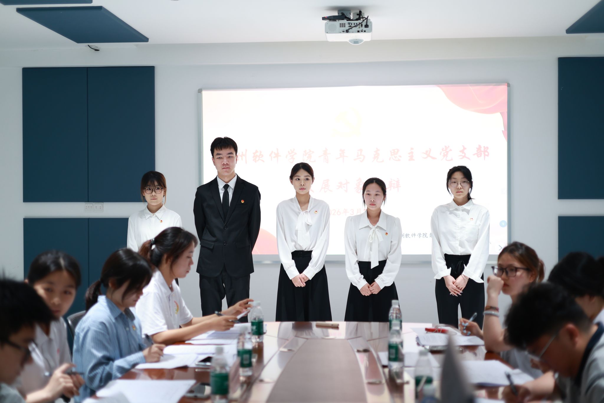 本网讯 为深入贯彻落实全面从严治党要求,规范党员发展工作,切实把好党员发展“入口关”和“质量关”,广州软件学院青年马克思主义党支部(简称“青马党支部”)于2026年3月27日13:30在新政楼211会议室和新政楼208会议室举行2025-2026学年第二学期拟发展对象答辩会。青马党支部余润珠书记、学校团委郑少涌副书记、3名学校团委专职团干、8名学生党员代表以及12名入党积极分子作为拟发展对象参加本次会议,青马党支部何培楠同志主持本次会议。