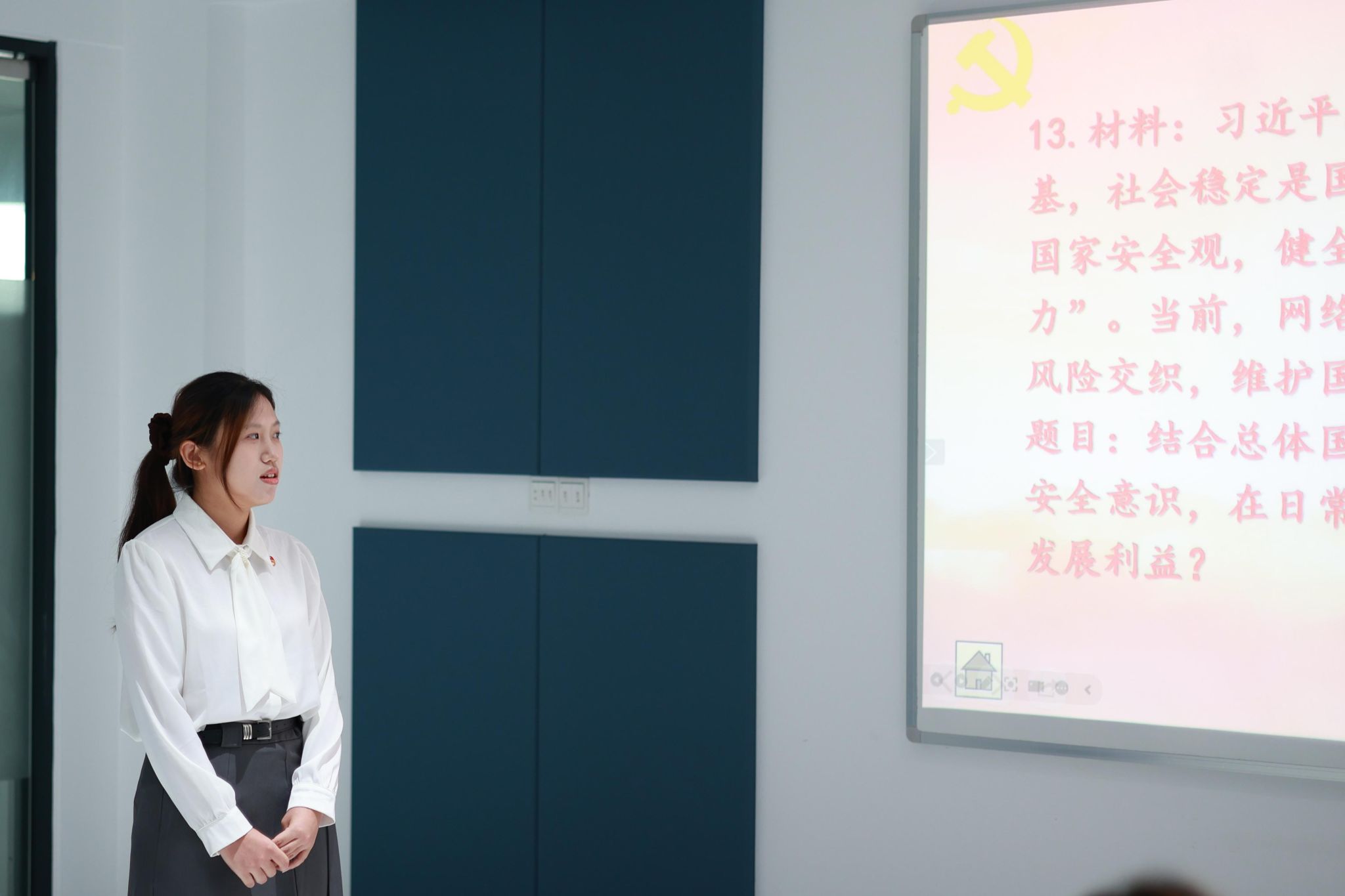 拟发展对象自我介绍环节结束后,进入抽取时政题目并分析解答环节。拟发展对象分别回答了“‘十五五’时期全面发力对实现社会主义现代化的重要作用”“分析树立和践行正确政绩观的现实紧迫性”等时政热点问题,他们的回答展现出了对国家政策和社会发展的关注与理解。在回答过程中,拟发展对象们逻辑清晰、观点明确,充分展现了扎实的理论基础和良好的思维能力。