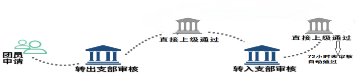 提交成功后,由转出团支部手动审核,再依次流转到转出团支部直接上级团组织、转入团支部、转入团支部直接上级团组织审核。