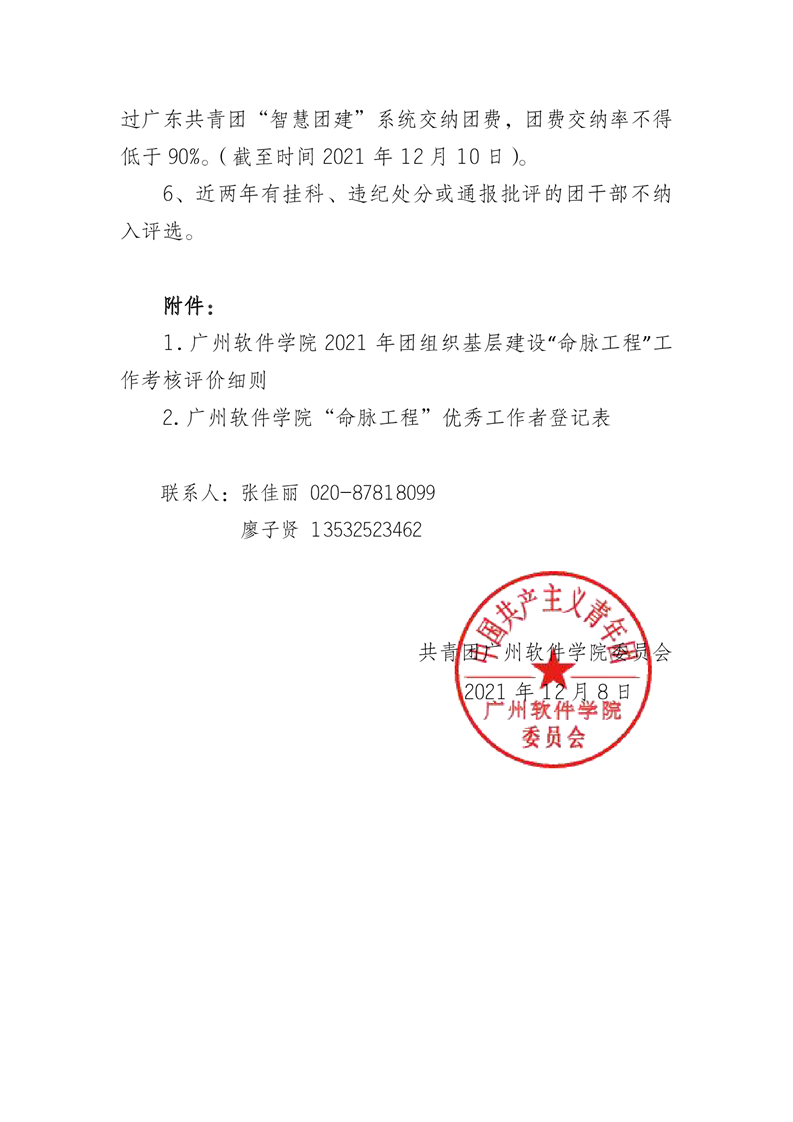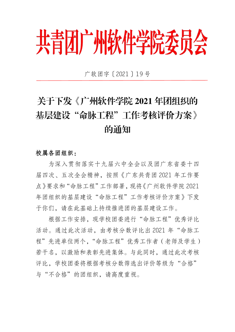 关于下发《广州软件学院2021年团组织的基层建设“命脉工程”工作考核评价方案》的通知