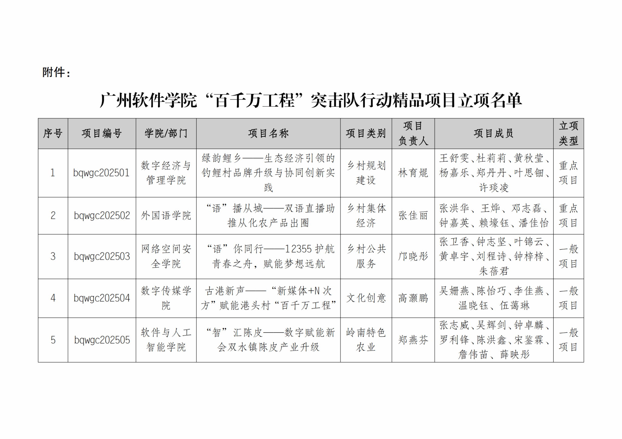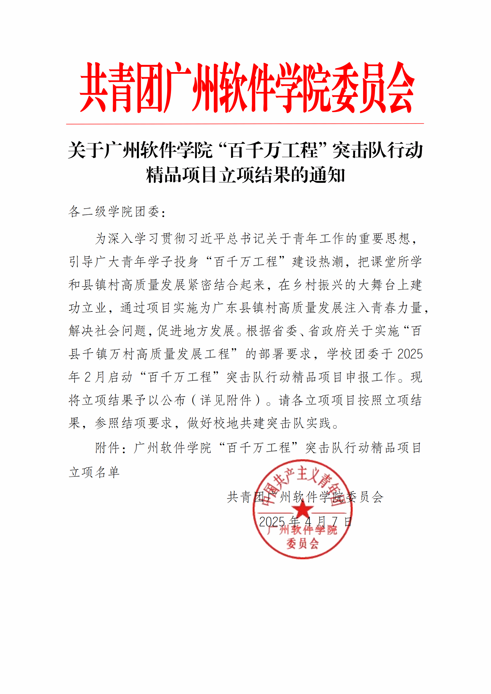 关于广州软件学院“百千万工程”突击队行动精品项目立项结果的通知