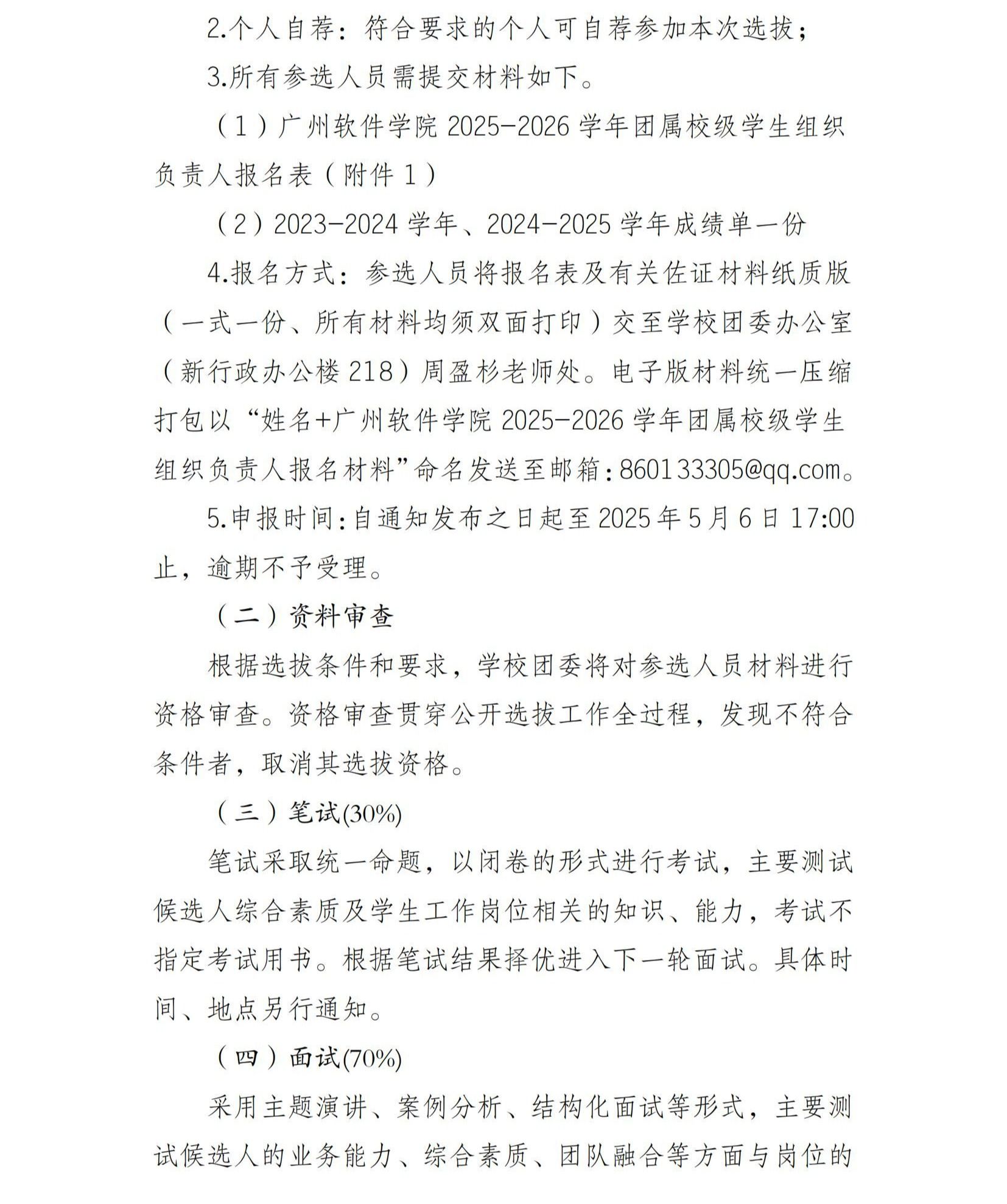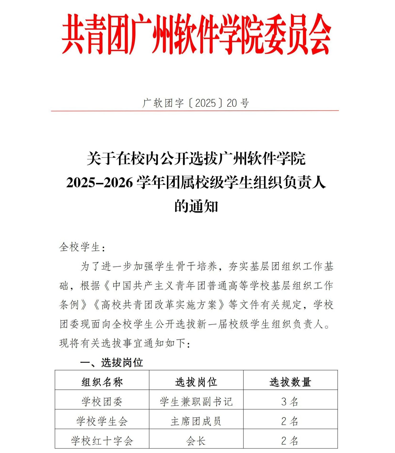 关于在校内公开选拔广州软件学院2025-2026学年团属校级学生组织负责人的通知