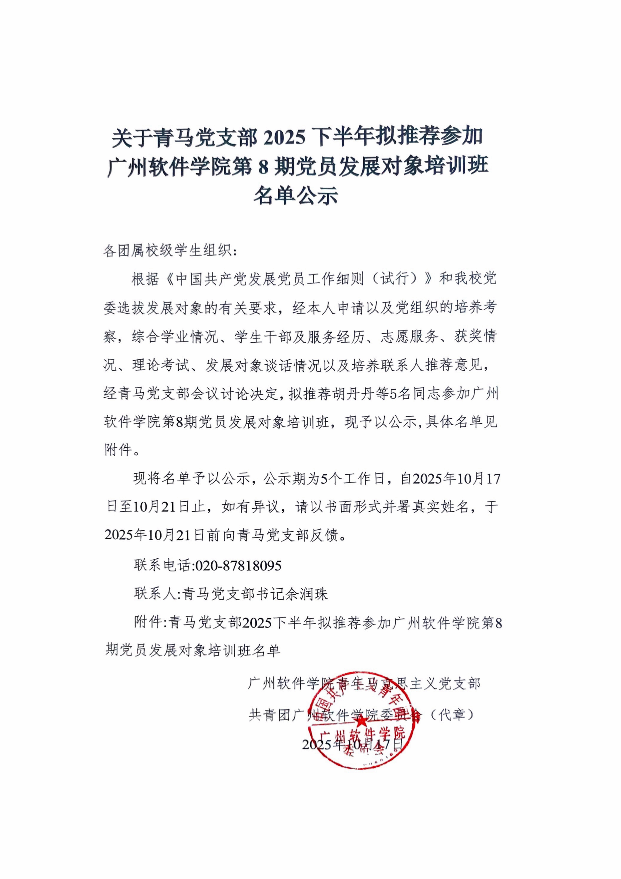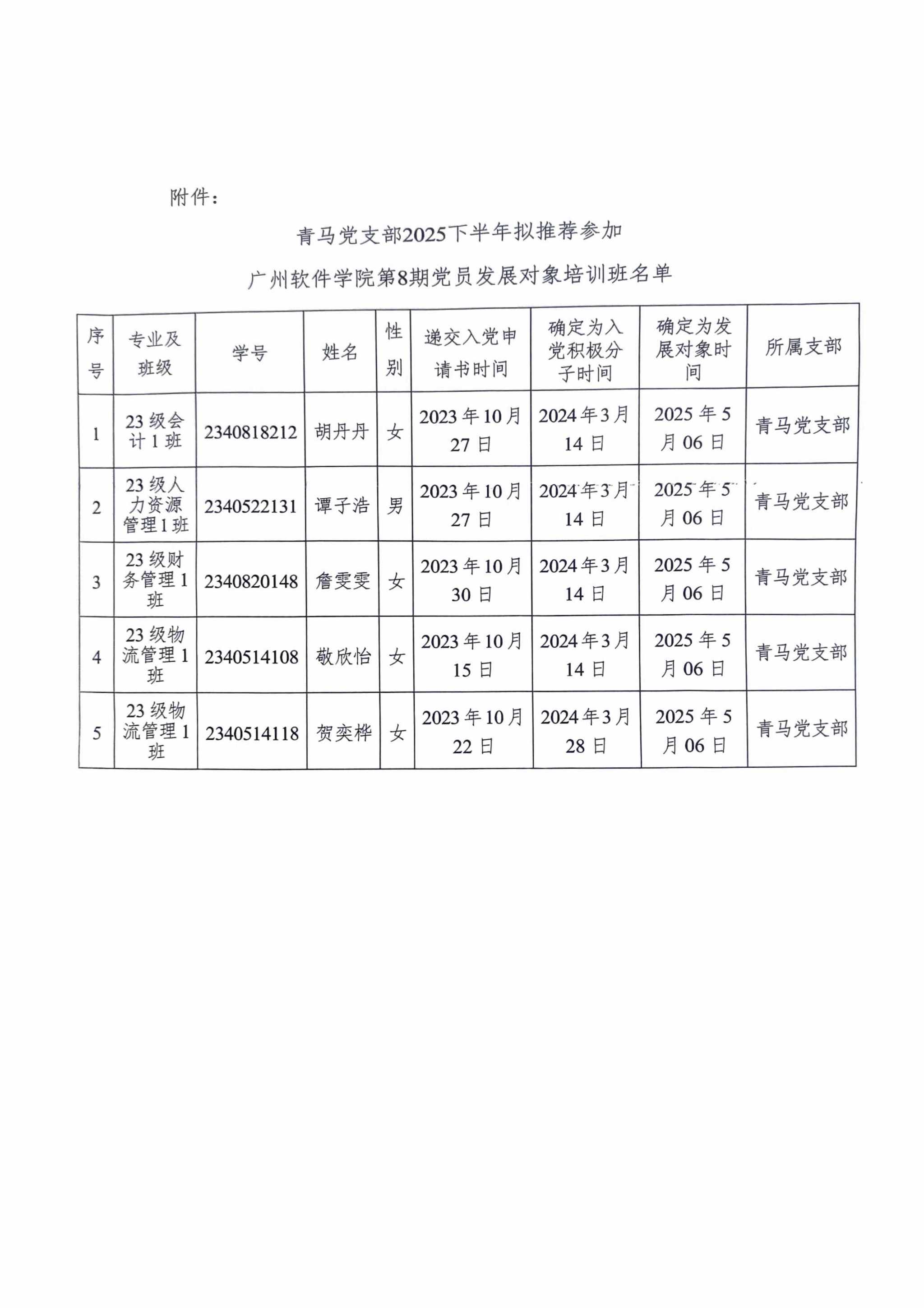 关于青马党支部2025下年拟推荐参加广州软件学院第8期党员发展对象培训班名单公示