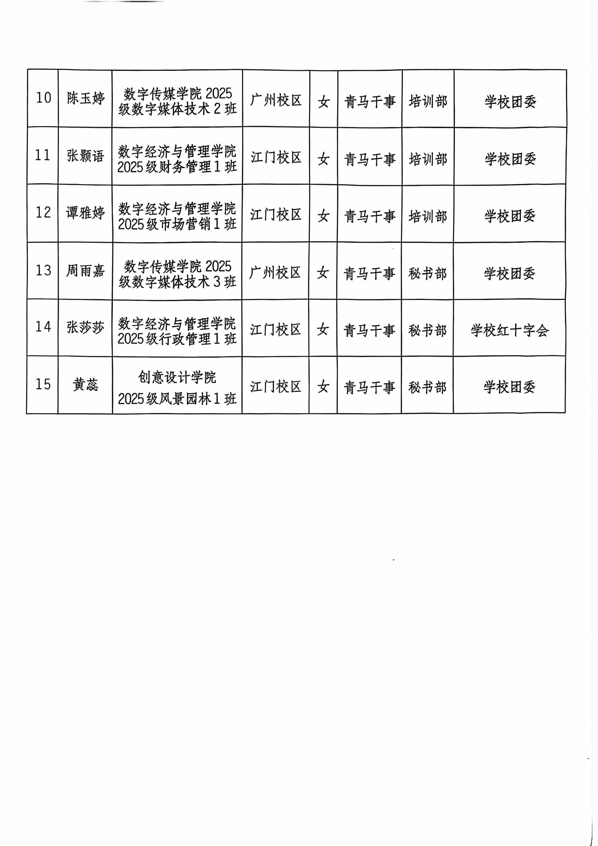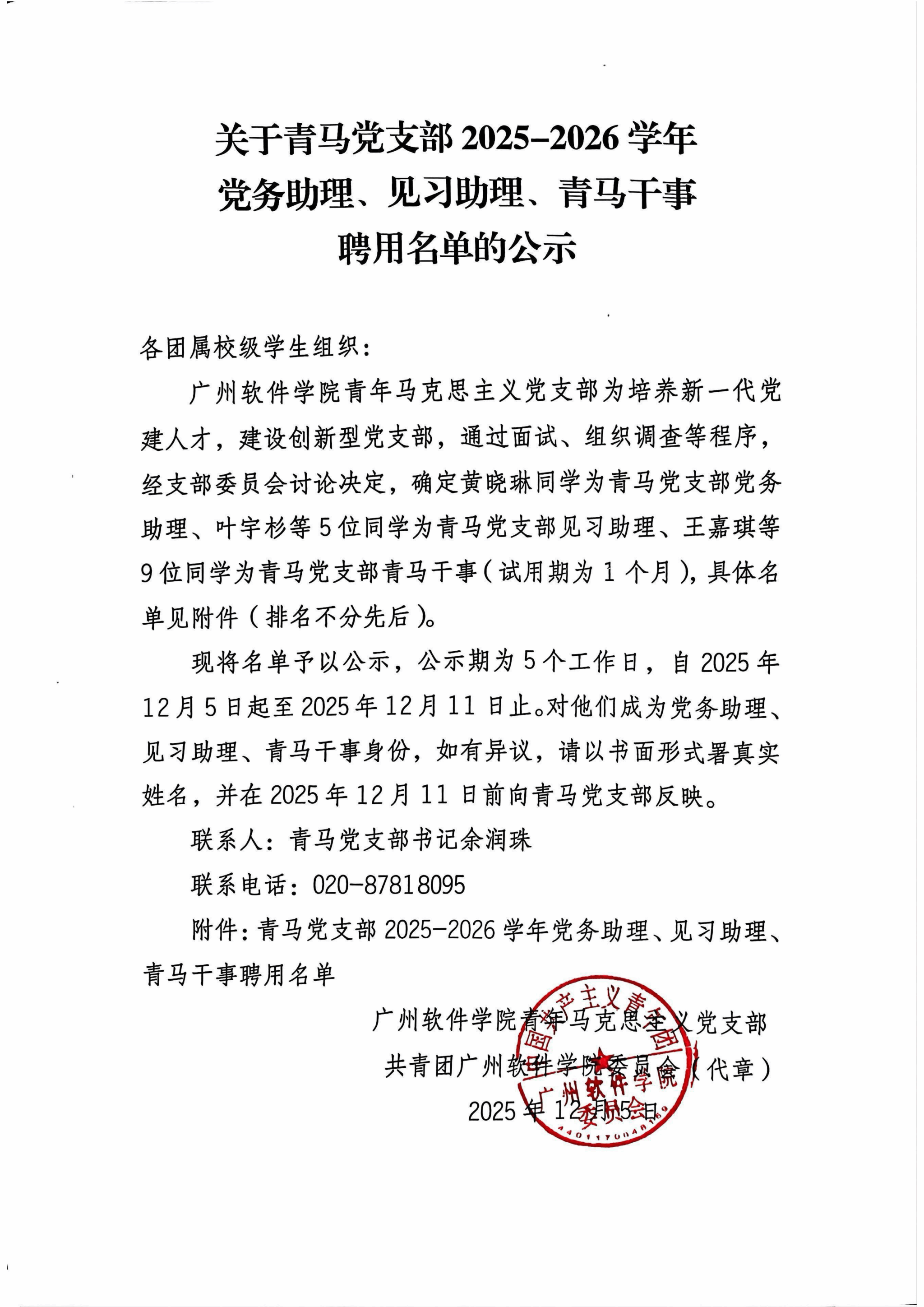 关于青马党支部2025-2026学年党务助理、见习助理、青马干事聘用名单的公示