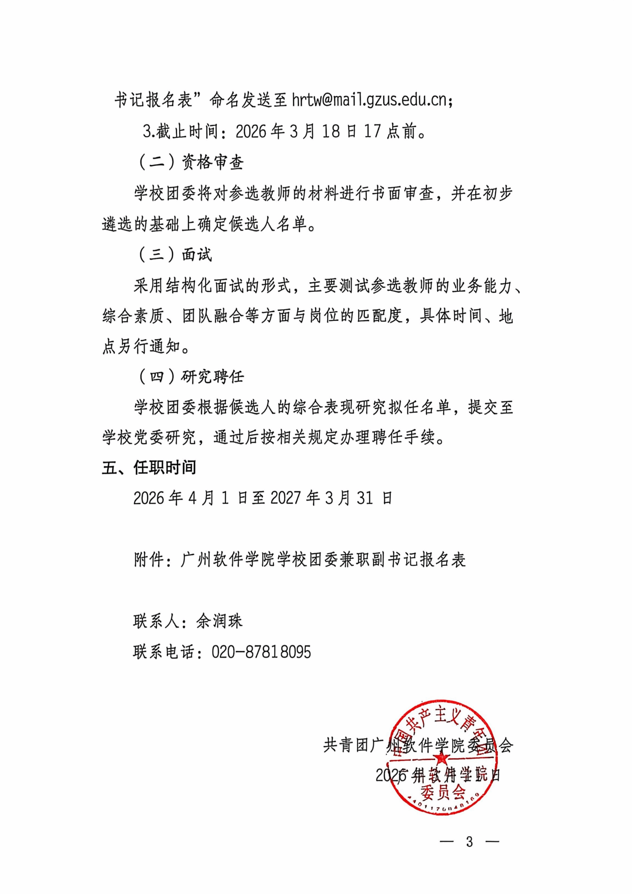 关于广州软件学院选聘2026年学校团委兼职副书记的通知