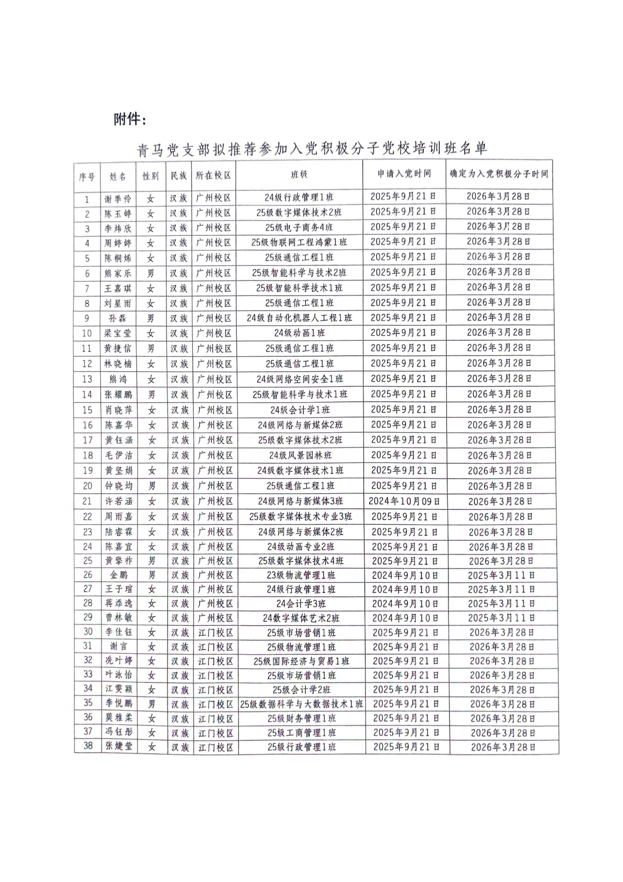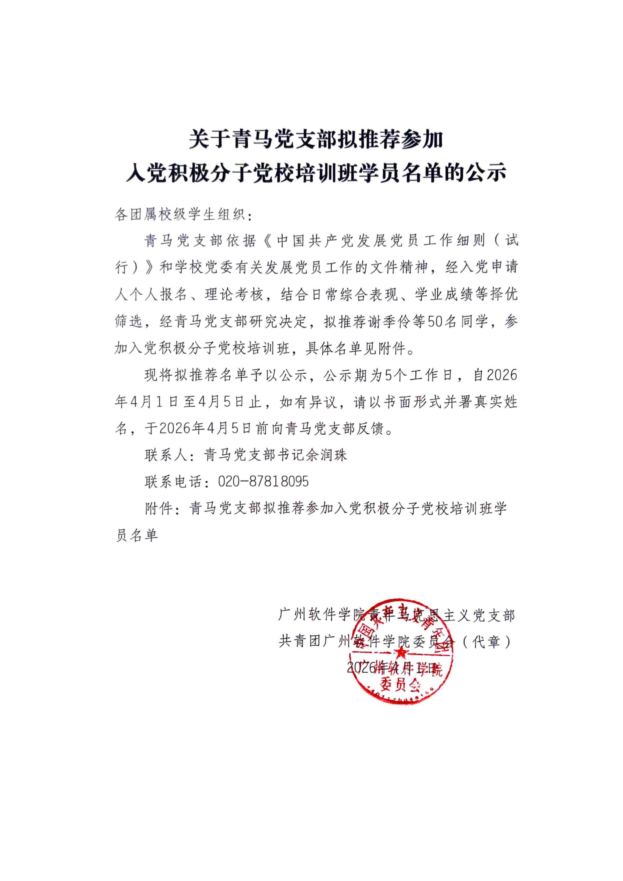 关于青马党支部2026上半年拟推荐参加广州软件学院第9期党员发展对象培训班名单的公示