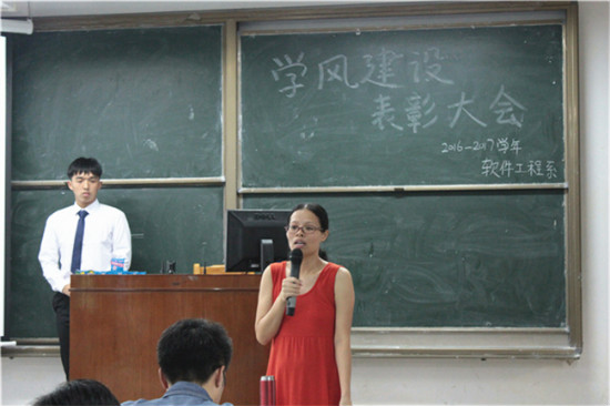 为加强软件工程系优良学风班风建设,9月26日,软件工程系于B201举行2016-2017学年学风建设表彰大会。党总支徐向春书记、黄金飞老师、郑创兴老师、杨澄生老师、陈玉菲老师以及宋安娜老师出席了本次会议。