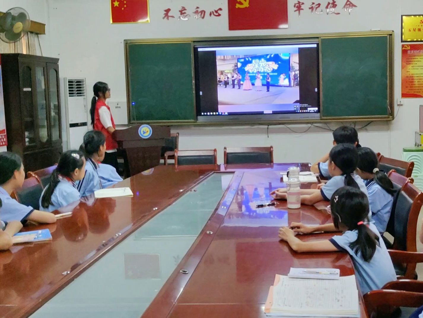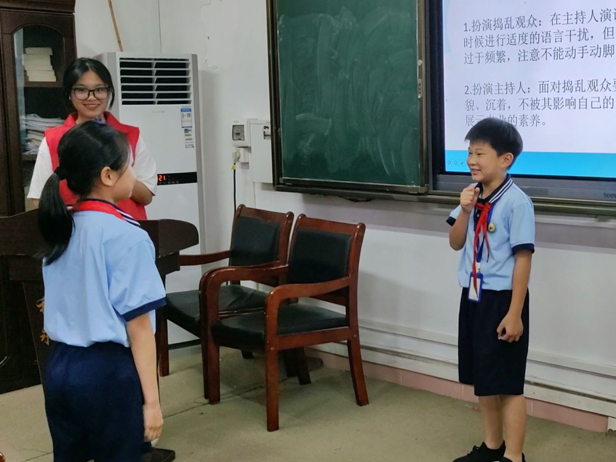 为了让孩子们更直观地感受主持的魅力,队员们设计了丰富的实践环节。学生们分组模拟校园活动主持场景,从自我介绍到即兴播报,队员们手把手指导,帮助孩子们调整语调、表情和肢体语言。