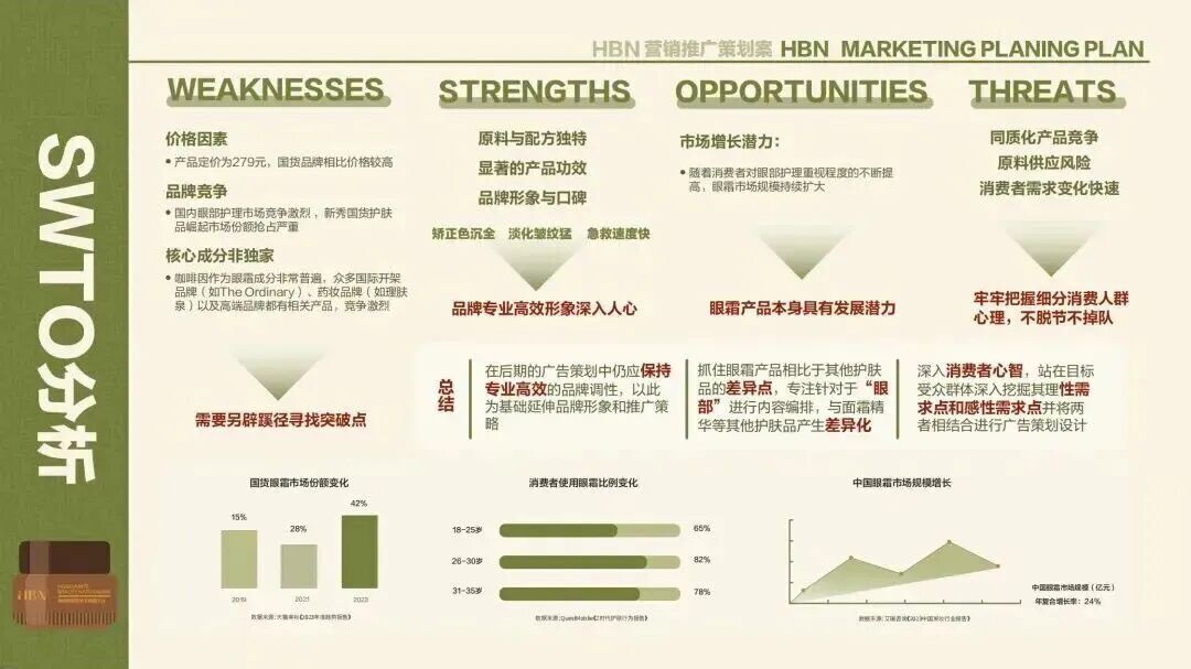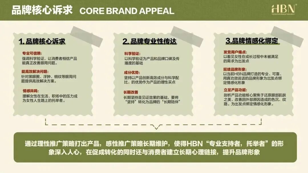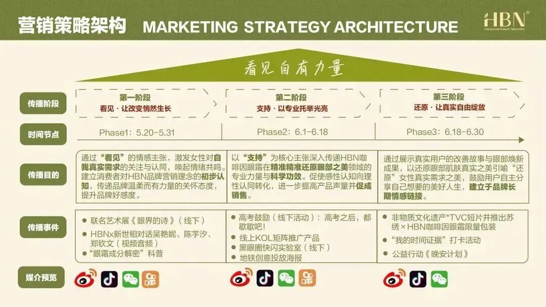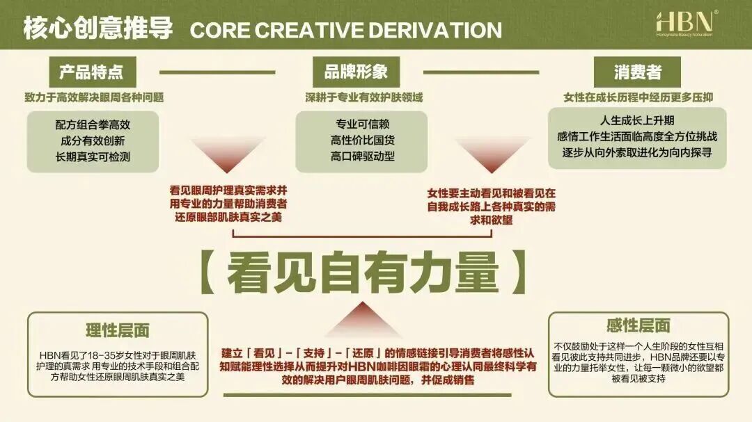 策划案聚焦于将产品(HBN咖啡因眼霜)特点与目标用户痛点相结合,以深入挖掘产品特征和体察用户需求为根本,精准打击用户心智进行主题立意和具体活动开展,旨在从用户心智层面和真实功效层面,多角度塑造品牌形象,提升产品认可度和品牌信任度。策划全案以《看见自有力量》为总主题引出三个阶段的小主题,层层深入,形成一套将产品、品牌、用户深度绑定的广告营销策划案。