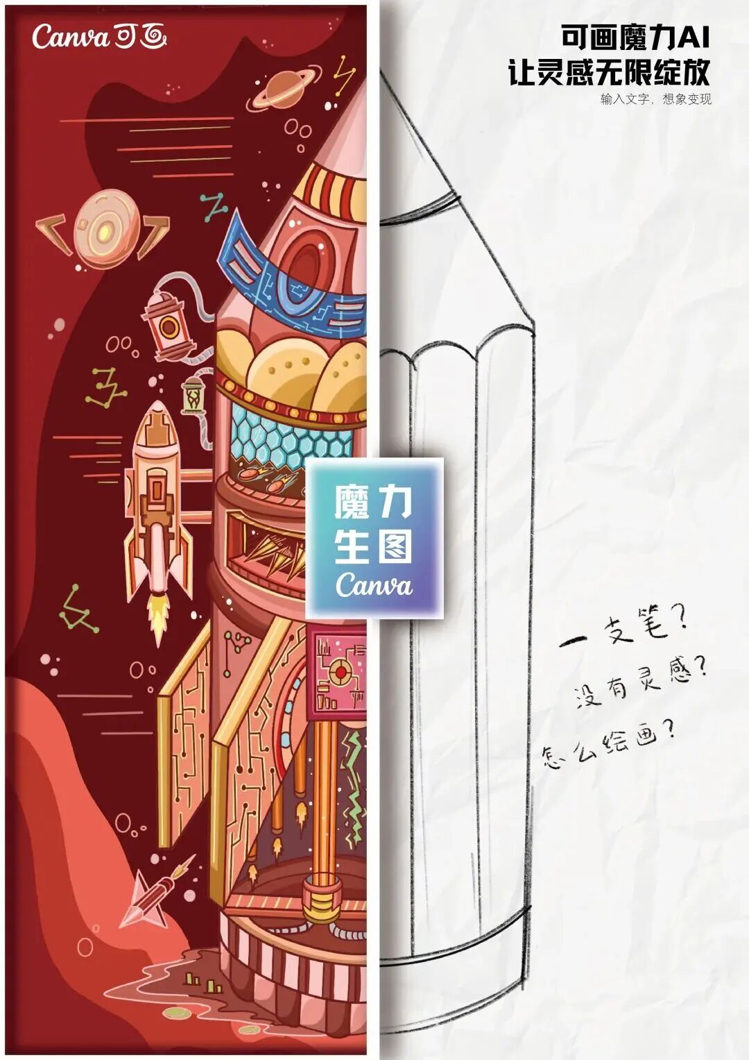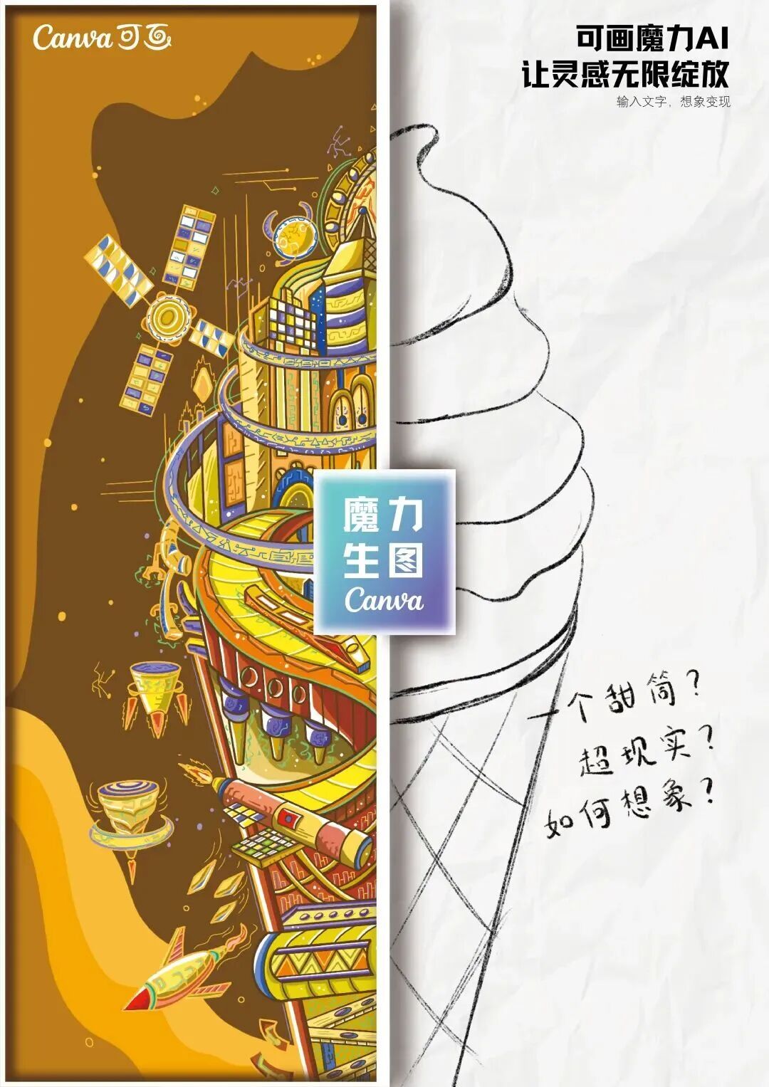 该作品的系列海报以“所想皆可画”为主题,展现可画魔力工作室AI生图功能。运用置换同构与联想手法,第一张铅笔变火箭,隐喻创意突破,诠释AI突破传统局限;第二张树木进化为未来科技树,彰显AI拓展想象边界;第三张解构重组甜筒,构建超现实场景,体现AI构建力。三幅海报共同呈现从灵感枯竭到创意爆发的转变,凸显可画AI生图功能之强大。