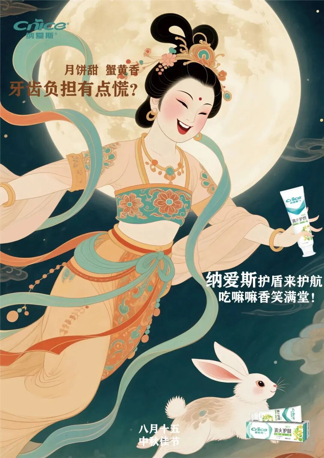 该作品是一个为纳爱斯为题的广告海报设计,以中秋节为主体,突出“草本消炎、中秋护航、清凉降火”的核心信息;以中国传统神话“嫦娥奔月”和“玉兔捣药”为灵感载体,巧妙嫁接纳爱斯的核心功效(消炎、防蛀、降火),营造充满东方奇幻色彩的品牌故事,传递纳爱斯牙膏如同月宫仙方般专业、天然、有效的护齿理念,特别强调其中秋时节和日常口腔健康的守护作用。国潮插画风格,兼具传统韵味与现代审美,突出仙境的唯美与产品的亲和力。