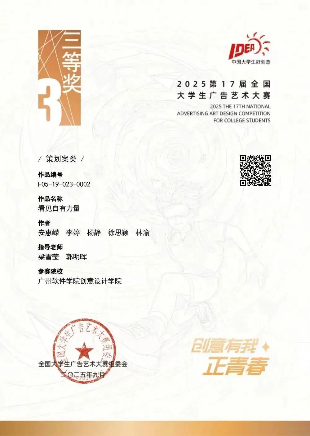 其中,作品《看见自有力量》(成员:安惠嵘、李婷、杨静、徐思颖、林渝;指导老师:梁雪莹、郭明晖)获得全国三等奖,作品《龈炎退散广寒静,齿健生辉中秋明》(成员:林心盈;指导老师:梁雪莹)和《可画魔力 A1,让灵感无限绽放》(成员:刘鹏程、马俊焯;指导老师:梁雪莹)获得全国优秀奖。创意设计学院梁雪莹、周小慧两位老师凭借出色的指导表现,荣获广东赛区竞赛“优秀指导老师”称号。
