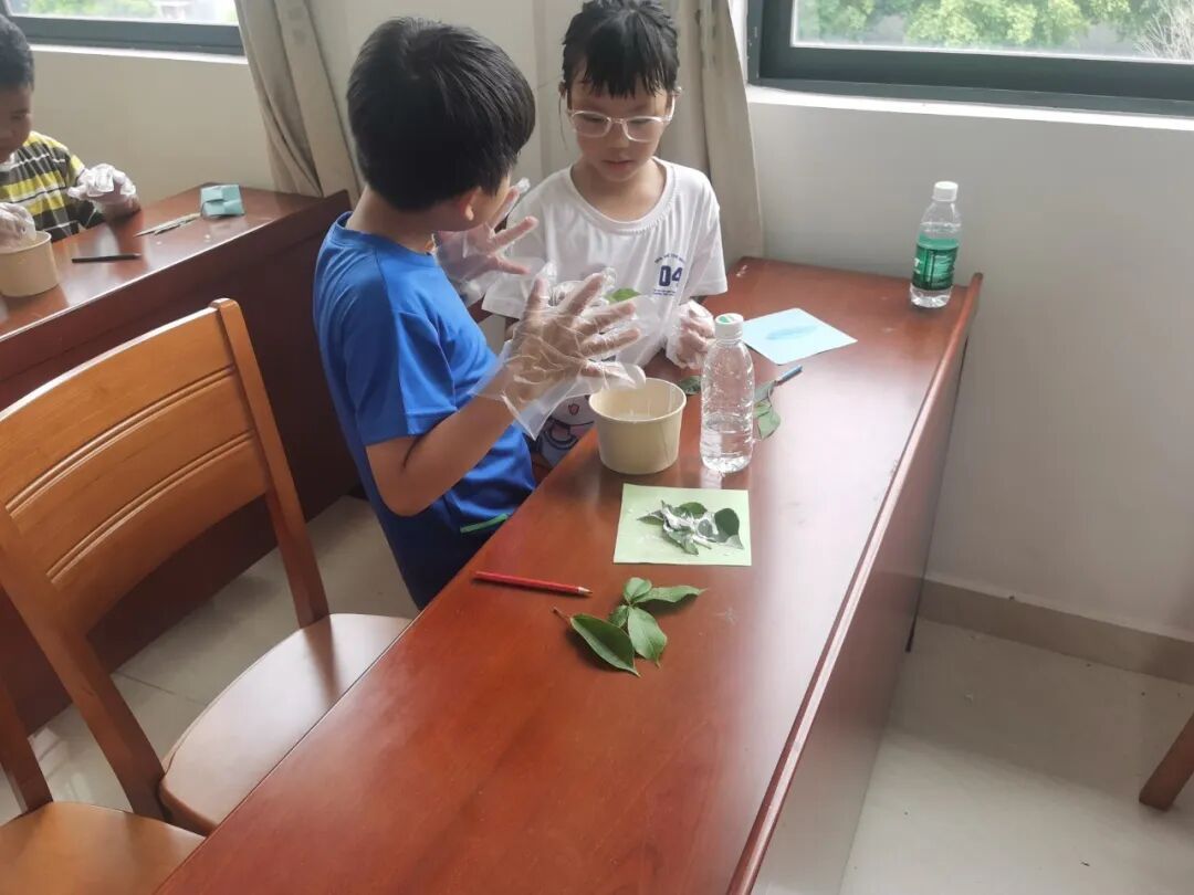 活动第三天,一场“化石手工拓印”课点燃了孩子们的创意火花。小老师们先讲解化石形成原理,再指导石膏拓印实践,孩子们用叶片脉络细心拓印,制作出独一无二的“史前印记”,涂色时专注的眼神,让他们仿佛化身为真正的考古学家。