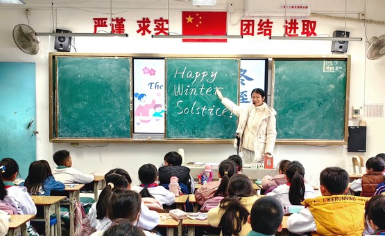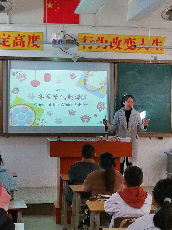 在丘厝小学的课堂上,支教老师为孩子们讲解冬至相关知识,学生在老师带领下声情并茂地朗诵冬至诗歌,满怀热情地绘画冬至手抄报,把对冬至的理解与祝福融入到作品中。