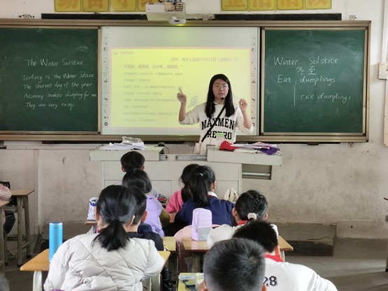 在东龙小学的课堂上,支教老师用中英文为孩子们介绍冬至的起源、习俗、意义等,孩子们通过看图猜词游戏学习冬至的传统美食的中英文表达,如饺子(dumpling)、汤圆(sweet dumpling)等,孩子们还进行了冬至双语手抄报创作,对冬至节日有了更加生动且深入的了解。