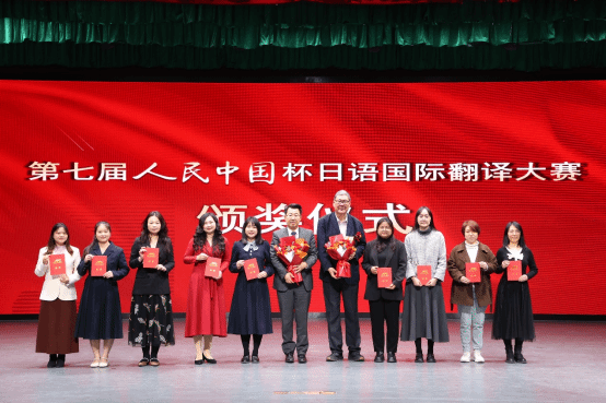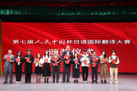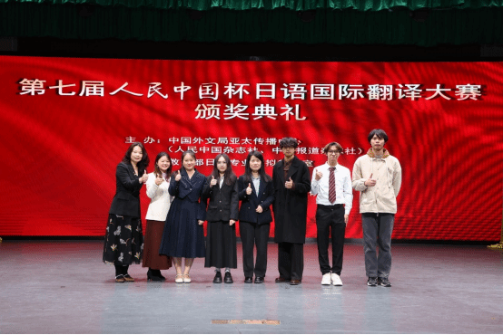 本网讯 2025年1月8日,第七届人民中国杯日语国际翻译大赛颁奖典礼在广东外语外贸大学隆重举行。颁奖典礼上,我校四位学生代表——李锦航、陈乐琪、陈立锵、梁家和,在四位带队老师李竹丽、王艳华、陈星裕、周宁宁的陪同下,满怀喜悦与自豪地踏上了红毯,接受了大赛组委会颁发的荣誉证书。日语专业教研室主任李竹丽老师代表学校接受了大赛组委会颁发的“优秀组织奖”。四位带队老师作为日语专业教师代表接受了大赛组委会颁发的“优秀指导教师奖”。