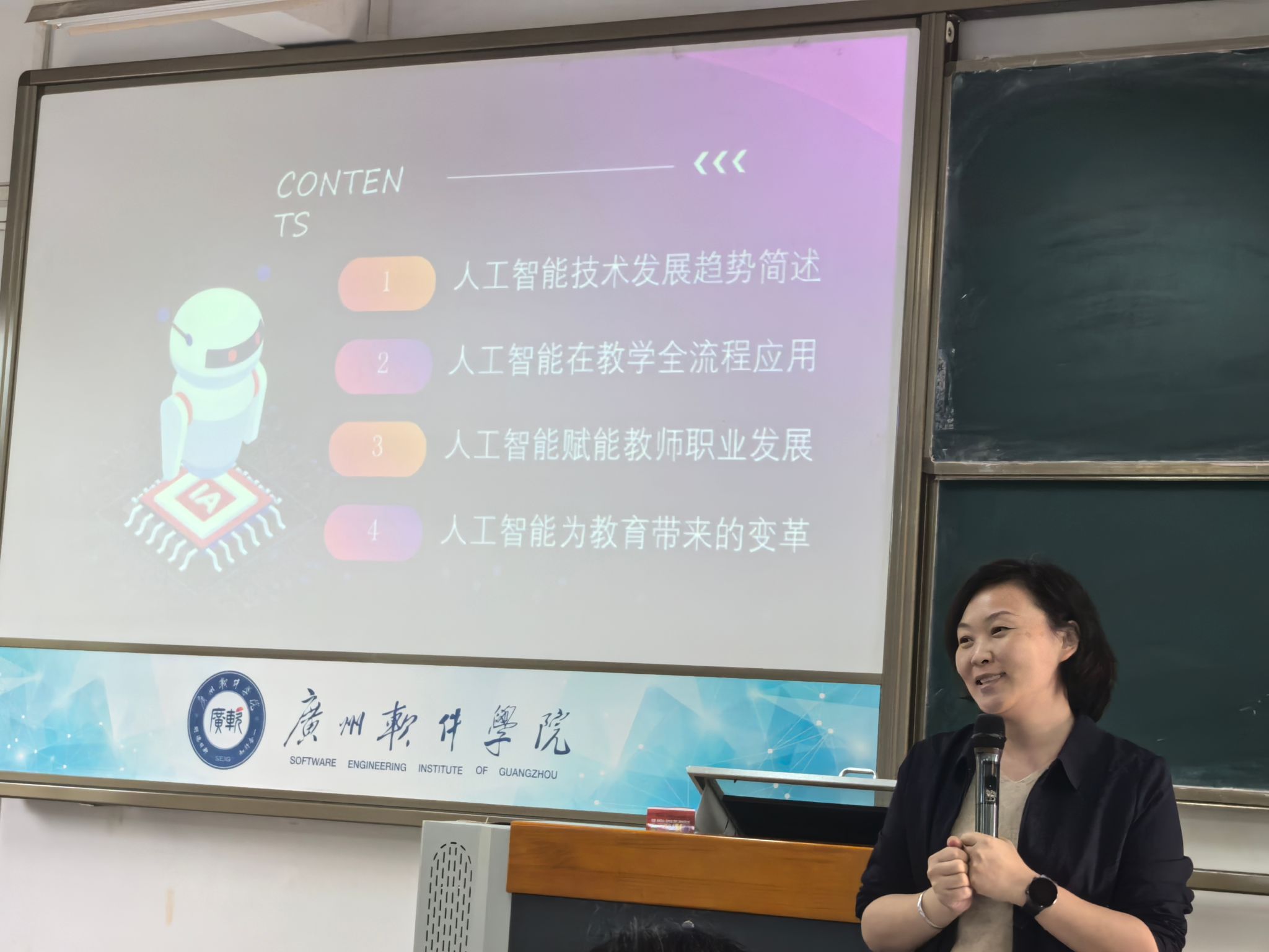 本网讯 2025年4月8日,广州软件学院外国语学院大学英语教研组在A201教室成功举办了一场主题为“人工智能在教学全流程中的应用”的讲座,本次讲座由陈聪老师主讲。