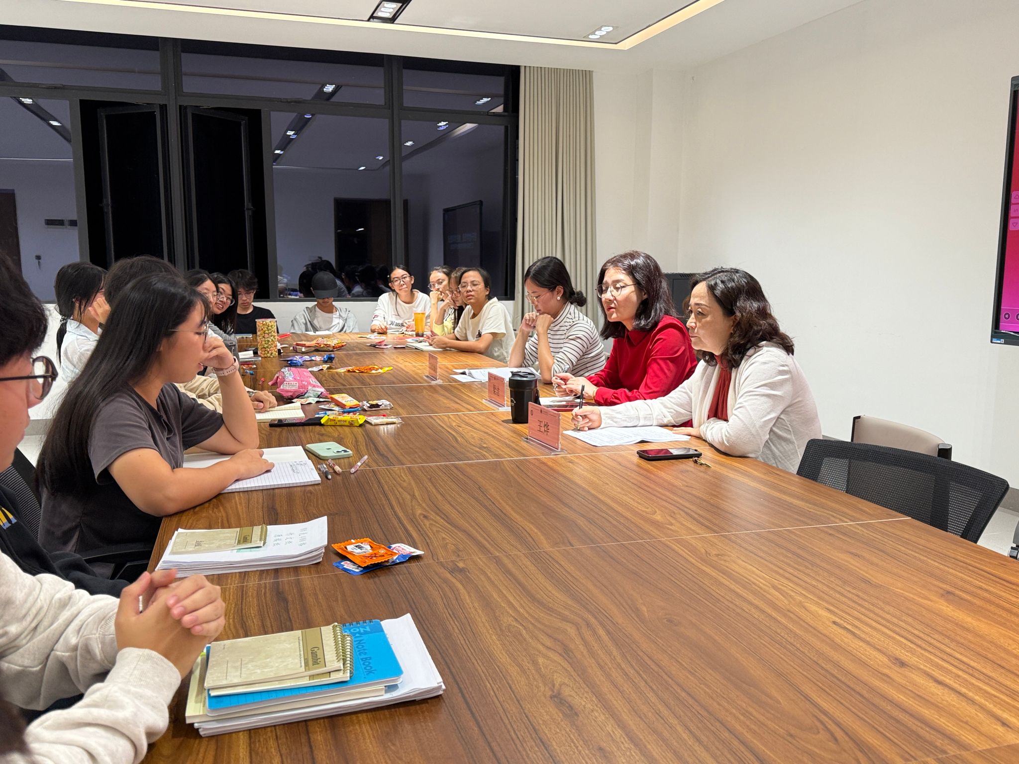 本网讯 2025年11月6日晚上,为深入了解我院江门校区新生在校学习、生活的实际情况,搭建学院领导与学生之间直接、高效的沟通桥梁,外国语学院组织召开“我与院长面对面”师生交流座谈会。出席本次会议的有院长梁洁、副院长王烨、学习导师和辅导员以及2025级各班学生代表。