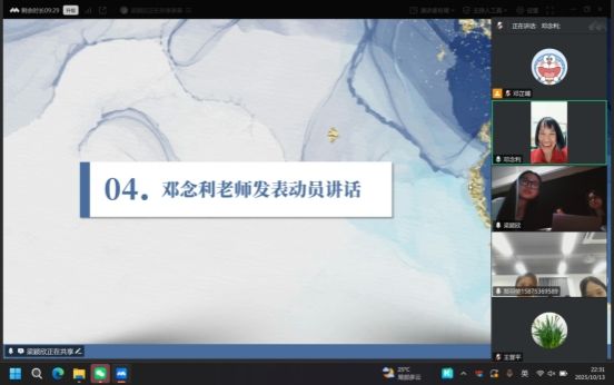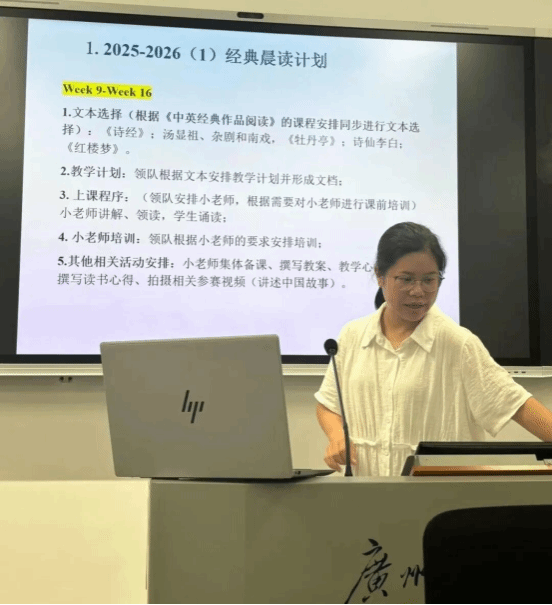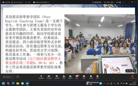 本网讯 为凝聚英语晨读教学力量,明确2025-2026学年晨读工作方向,助力营造浓厚语言学习氛围,2025 年 10 月 13 日晚,英语经典晨读教学团队采用“线上+线下”结合模式,分别在江门校区H3-601(线下)与广州校区(线上)同步召开2025-2026学年英语经典晨读动员暨培训大会。出席本次会议的有大英教研室主任冯保玲老师,王晋平教授,杨志文老师,指导老师邓念利老师、黄秀琴老师,英语晨读朋辈教学团队领队以及英语经典晨读全体教员。