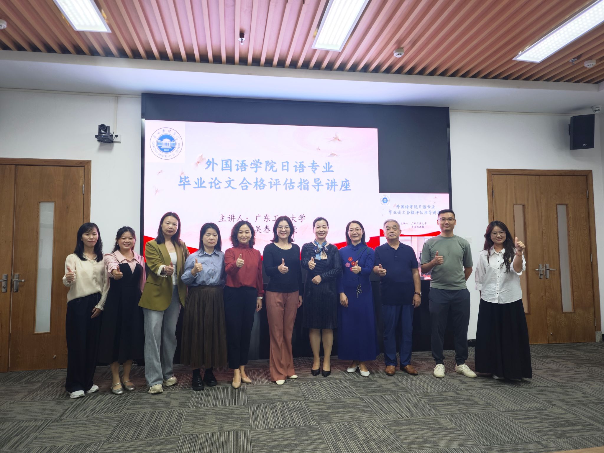 本网讯 2025 年 10 月 21 日,广州软件学院外国语学院精心组织专题讲座,特邀校外专家广东工业大学吴春燕教授莅临分享,围绕 “本科专业毕业论文” 核心主题作主旨演讲。外国语学院院长梁洁、副院长王烨、日语专业负责人王丽娜、日语教研室主任李竹丽及全体日语教师出席本次活动,共同参与学习交流。
