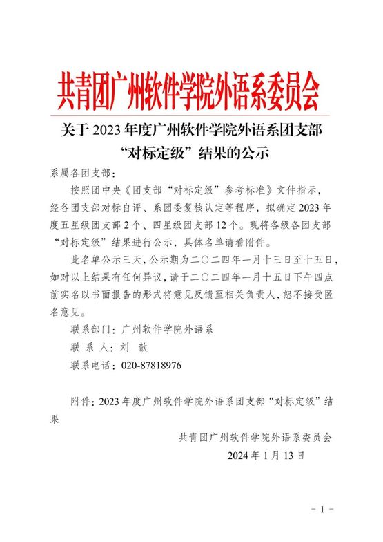 【公示】关于2023年度广州软件学院外语系团支部“对标定级”结果的公示
