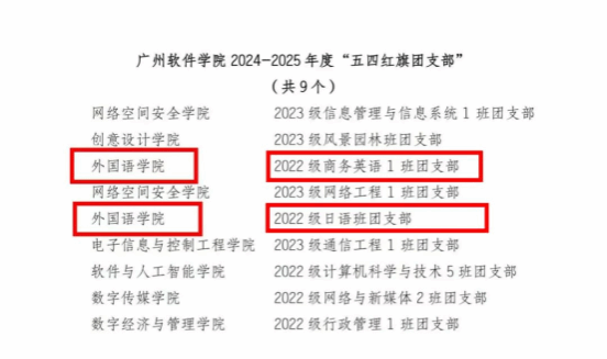 本网讯 根据《关于开展广州软件学院 2024-2025年度共青团系统评优工作的通知》(广软团字〔2025〕19号)文件要求,外国语学院在广州软件学院共青团2024-2025年度五四表彰中荣获多项荣誉。外语学子以实际行动彰显新时代青年的使命与担当,谱写青年与时代的精彩篇章。