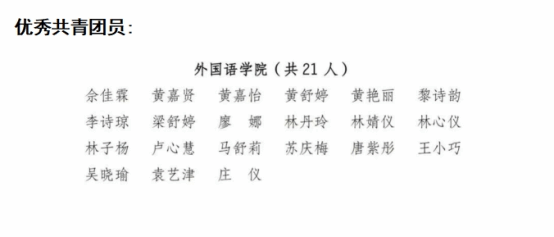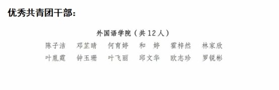 同时,我院共有12名同学获评“优秀共青团干部”,13名同学获评“优秀学生骨干”,21名同学获评“优秀共青团员”。