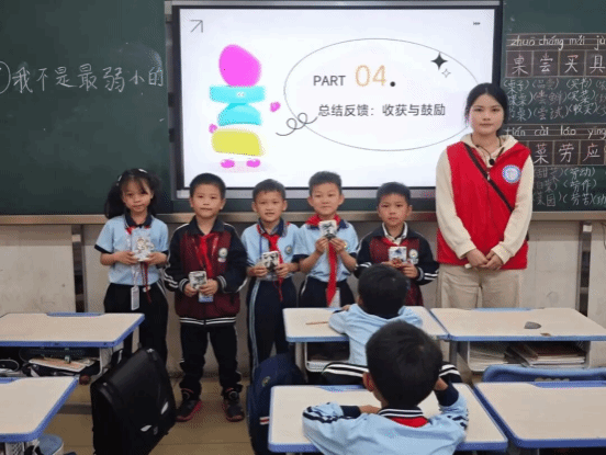 学生们认真专注,踊跃举手互动,积极开口表达,能够主动思考并回应问题,在循序渐进的学习中提升英语学习能力,初步感受英语学习的乐趣,完成了基础的英语启蒙。在课程结束后,志愿者们为表现优异的学生颁发小礼品,以温馨仪式定格成长瞬间,鼓励他们继续保持学习热忱,在英语启蒙的道路上持续探索。