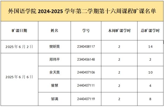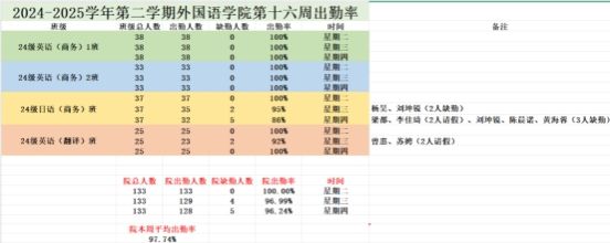 本网讯 为进一步规范对我院学生的教育和教学管理工作,严肃校规校纪,加强学风建设,根据《广州软件学院外国语学院学风建设方案》有关规定,实行每周一报制度,现将第十六周外国语学院24级早读情况以及各级课程旷课情况进行通报。