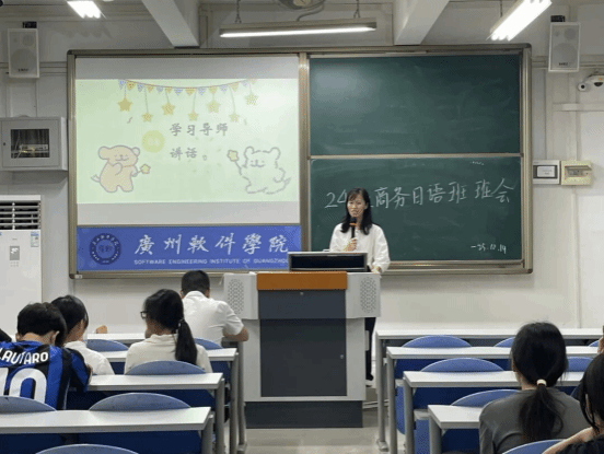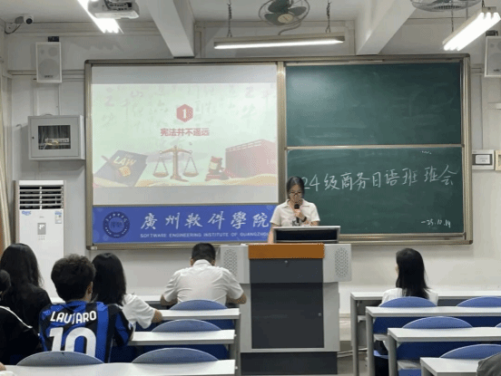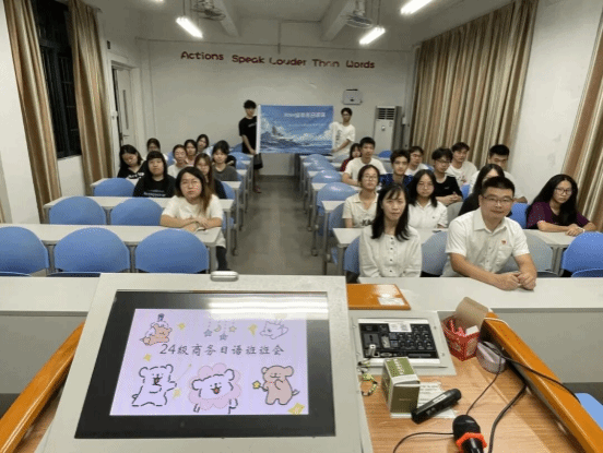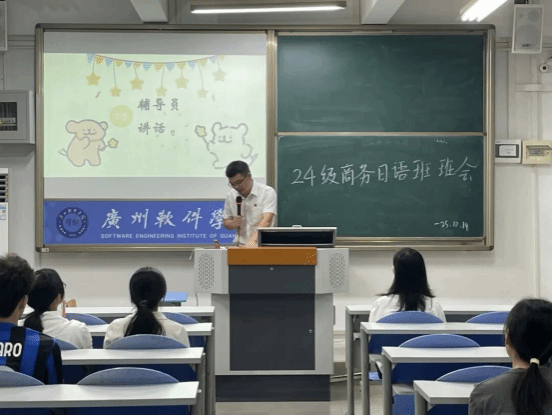 本网讯 2025年10月14日,外国语学院24级商务日语班于C205课室召开2025-2026学年第二次班会。出席本次班会的有辅导员刘歆老师、学习导师银胜凤老师以及24级商务日语全体同学。