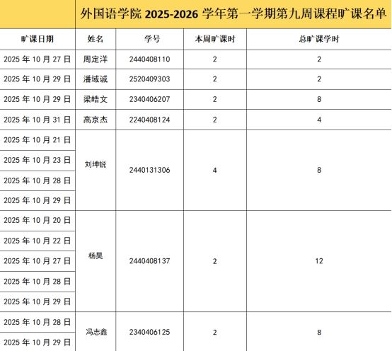 课程旷课情况第九周