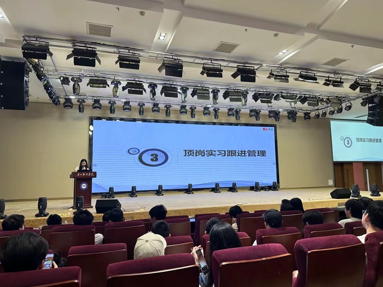 首先,钟美燕女士为大家讲解顶岗实习的流程,分为准备阶段和实施阶段。准备阶段为了解学生意愿和收集企业实习生需求。实施阶段在9月到10月,主要进行顶岗实习岗前技能课、更新实习信息、就止推荐和面试跟进。