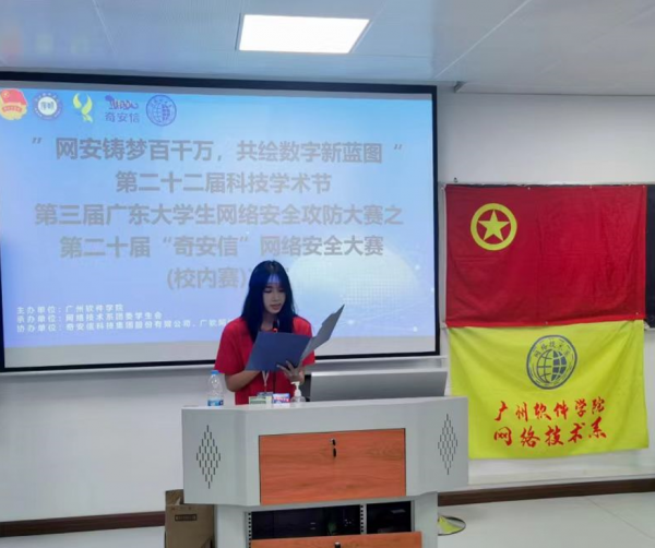 为了进一步增强同学们的网络综合安全知识技巧,经过激烈的初赛角逐以及专业的模拟赛技术培训,网络技术系于4月26日19:00在S204举行了第二十二届科技学术节之第三届广东大学生网络安全攻防大赛之第二十届奇安信网络安全大赛决赛。本次比赛的出席嘉宾有网络技术系杨宇夏老师,网络技术系吴为老师,网络技术系团委副书记兼学生会秘书长邝晓彤老师。
