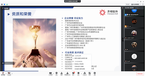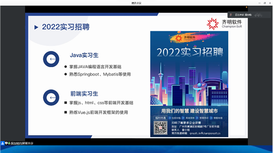 本网讯 网络技术系2022年4月1日19:00在腾讯会议召开线上广州软件学院第二十届科技学术节之齐明软件信息系统设计大赛技术培训。出席本次会议的嘉宾有广州市齐明软件科技有限公司研发中心负责人温加勉经理、网络技术系主任助理叶小艳老师、网络技术系团委副书记兼学生会秘书长邝晓彤老师。