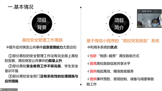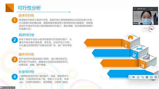主持人对本次比赛的规则进行讲解后,参赛队伍依次通过PPT的方式对作品进行简要介绍,并通过实操演示便于评委老师进一步了解参赛作品的核心内容。在答辩的环节里,参赛选手们认真思考,对评委老师提出的问题进行详细的回答,评委老师也对作品要改进的地方提出中肯的意见,便于选手们在赛后对作品进行优化和提升。
