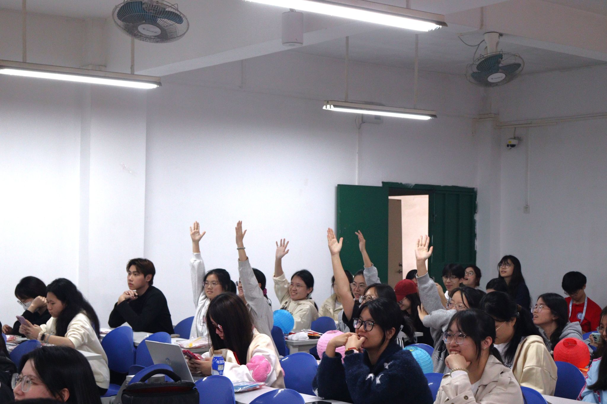 醒狮知识抢答环节,主持人依次提出醒狮相关知识问题,现场同学举手抢答,答对者可获精美礼品,现场同学们积极举手抢答,充分展现对醒狮文化的了解,活动氛围热烈活跃。