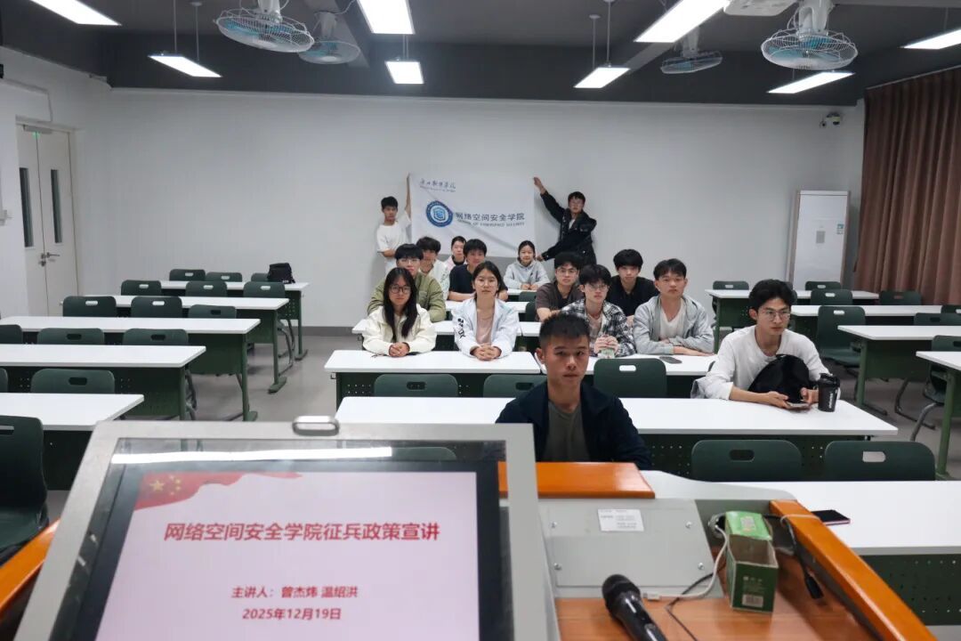 随后,曾杰炜学长围绕参军基本条件、报名流程、学业帮扶等八大方面展开详细讲解,还针对部队发展条件、退伍就业保障、入伍补贴补助及军士招收要求进行补充说明,呼吁符合条件的同学积极投身军营,为国防事业贡献青春力量。