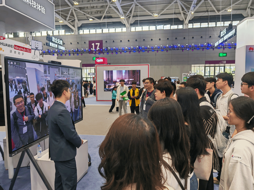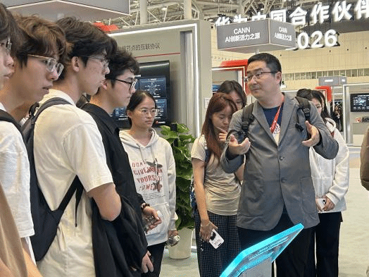 在华为核心展区,面对Atlas 900 A3 SuperPo超级计算集群等关键展品,周化院长为同学们展开了细致入微的专业讲解。从算力底层逻辑出发,深入剖析该集群基于昇腾AI芯片与鲲鹏计算生态的技术优势,实现技术架构拆解,将课堂上的虚拟化、容器编排等理论知识与超算集群的实际部署场景紧密衔接;然后,围绕 “科技自立” 核心要求,叮嘱同学们立足云计算专业根基,主动关注算力基础设施、云原生技术、国产生态等前沿方向。