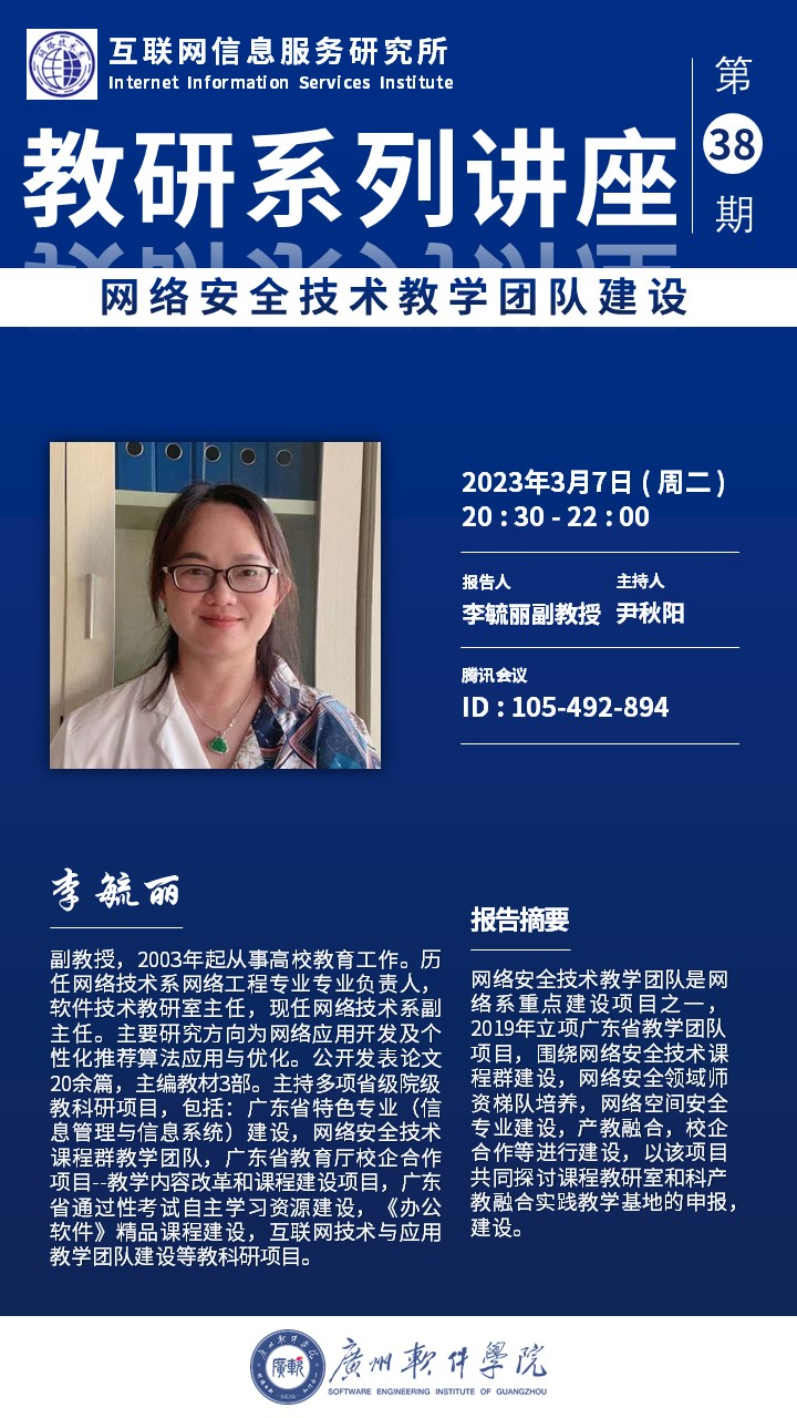 2023年3月7日晚8点30分,互联网信息服务研究所教研教改团队开展了本学期第1次活动(总第38期),本次教研活动由李毓丽副教授主讲,尹秋阳老师主持,主题为《网络安全技术教学团队建设》。本次以线上形式在腾讯会议开展,共吸引了30多位老师参与。