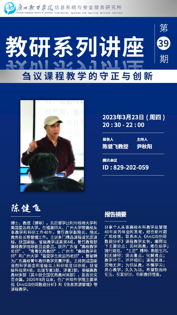 首先,陈教授结合新时期广软校情,联系本人《ArcGIS空间数据分析》课程教学实例,阐释以下主要论点:因材施教,难在劝学;践行规范,“工匠”精神: 熟能生巧,别无捷径:突出重点,化解难点;教学环节,环环相扣;课程思政,润物无声;为师从教,不懈学习;用心教学,久久为功。
